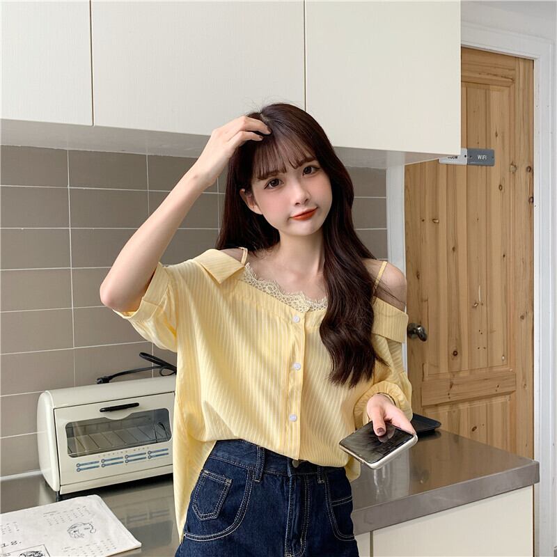 シャツ 肩出し オフショルダー オフショルストライプレースシフォントップス かわいい 可愛い ガーリー 大人可愛い 大人かわいい フェミニン 大人ガーリー ゆめかわ4315766 | nice import1