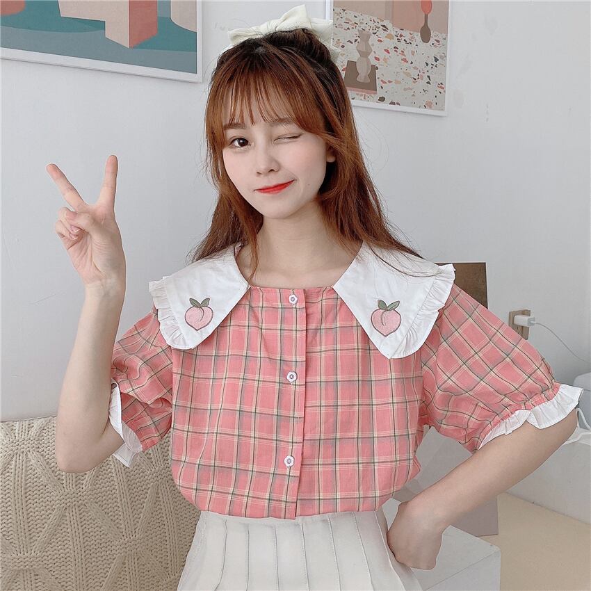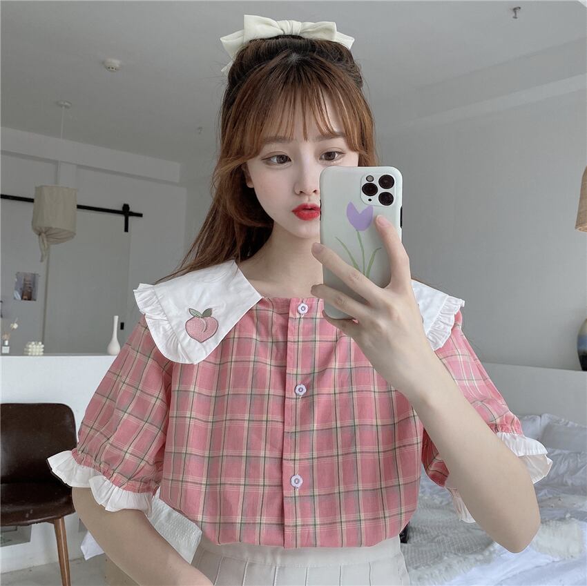 シャツ カラー格子柄 チェックトップス 薄手 ショート ショート丈 ミニ ミニ丈 ピンク かわいい 可愛い ガーリー 大人可愛い 大人かわいい フェミニン 大人ガーリー ゆめかわ8320635 | nice import1