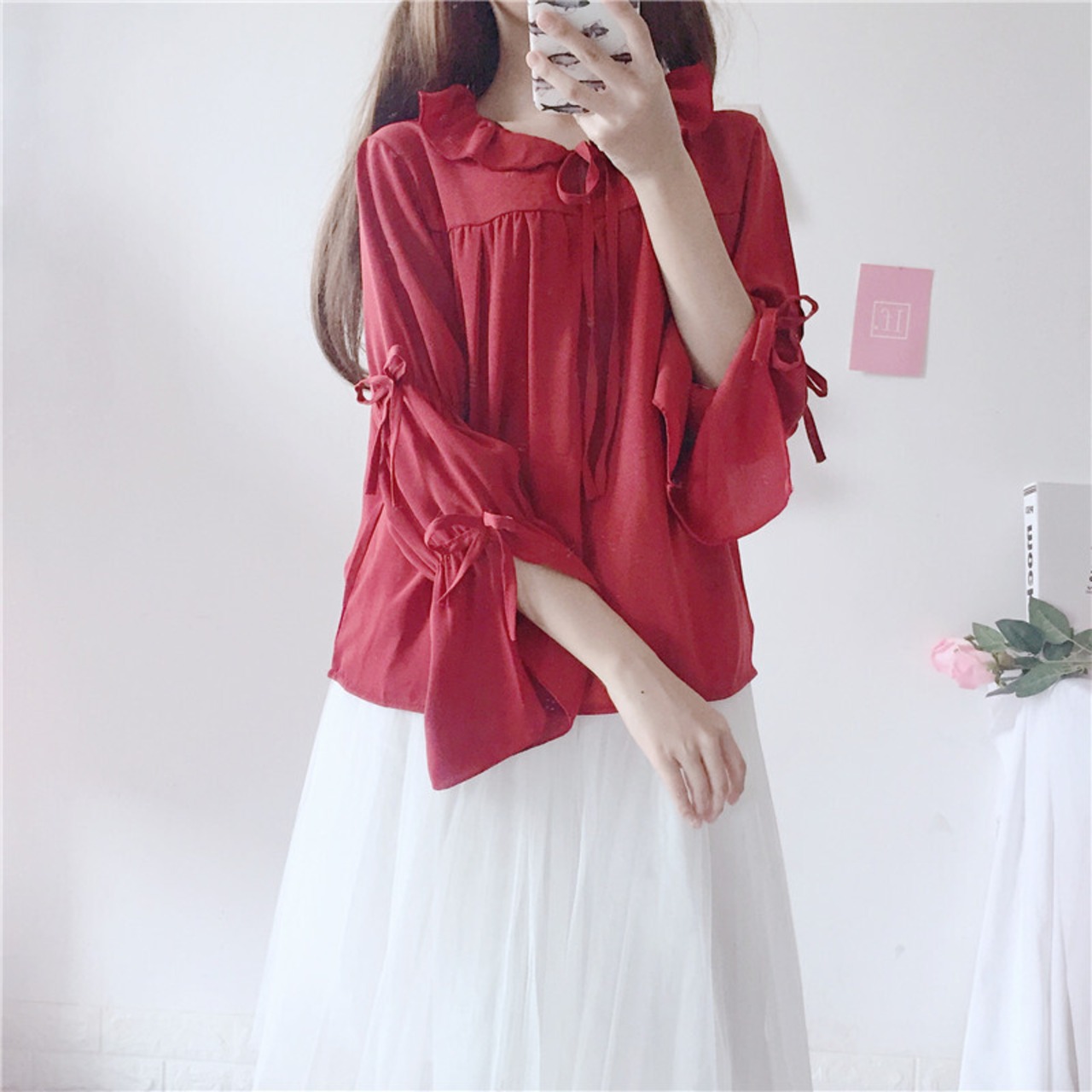 カラールーズスリーブ 袖シフォンシャツ ブラウス レッド 赤 トップス かわいい 可愛い ガーリー 大人可愛い 大人かわいい フェミニン 大人ガーリー 女性 レディース ゆめかわ0574161 | nice import1