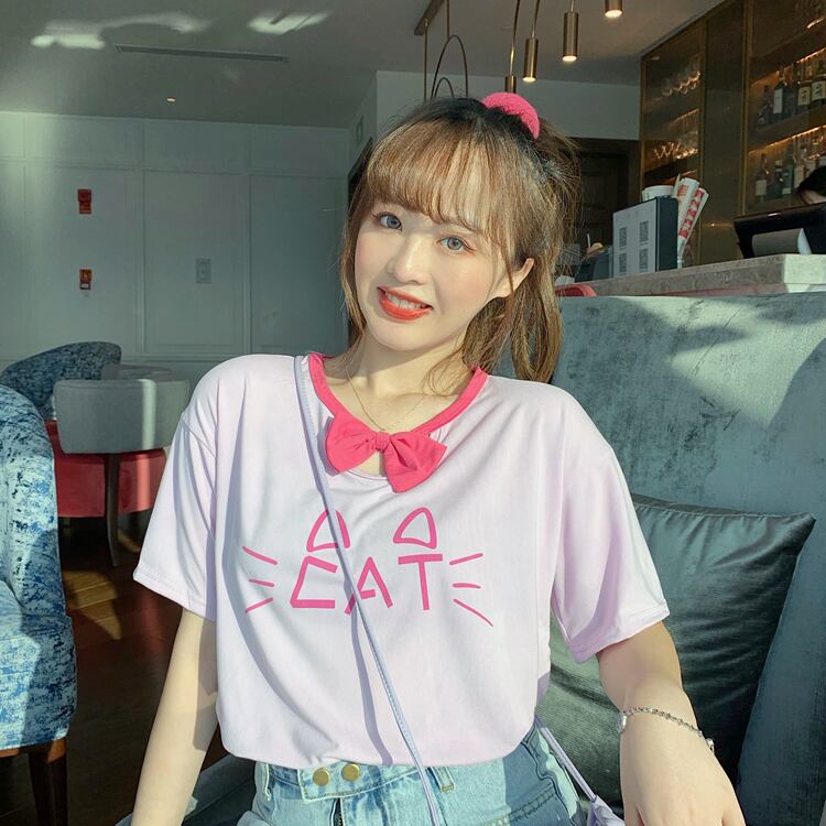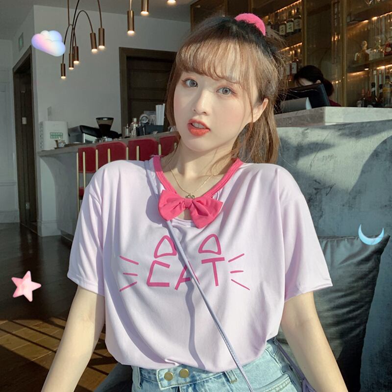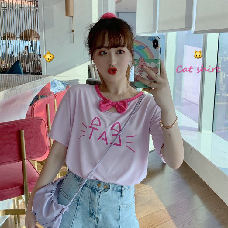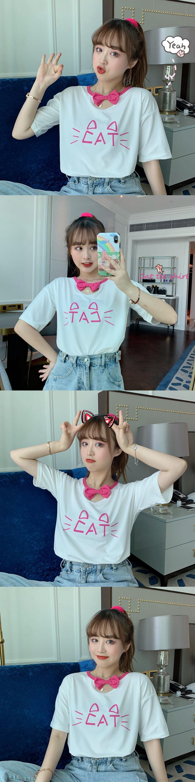 ルーズカラーラウンドネックリボンプリント柄Tシャツ ショート ショート丈 ミニ ミニ丈 かわいい 可愛い ガーリー 大人可愛い 大人かわいい フェミニン 大人ガーリー ステッチ ゆめかわ9336983 | nice import1