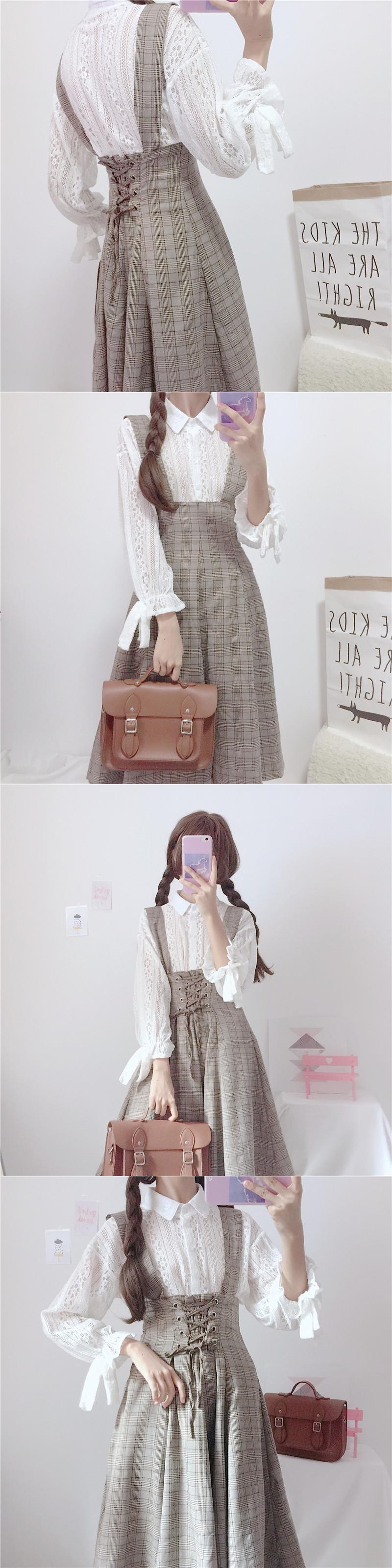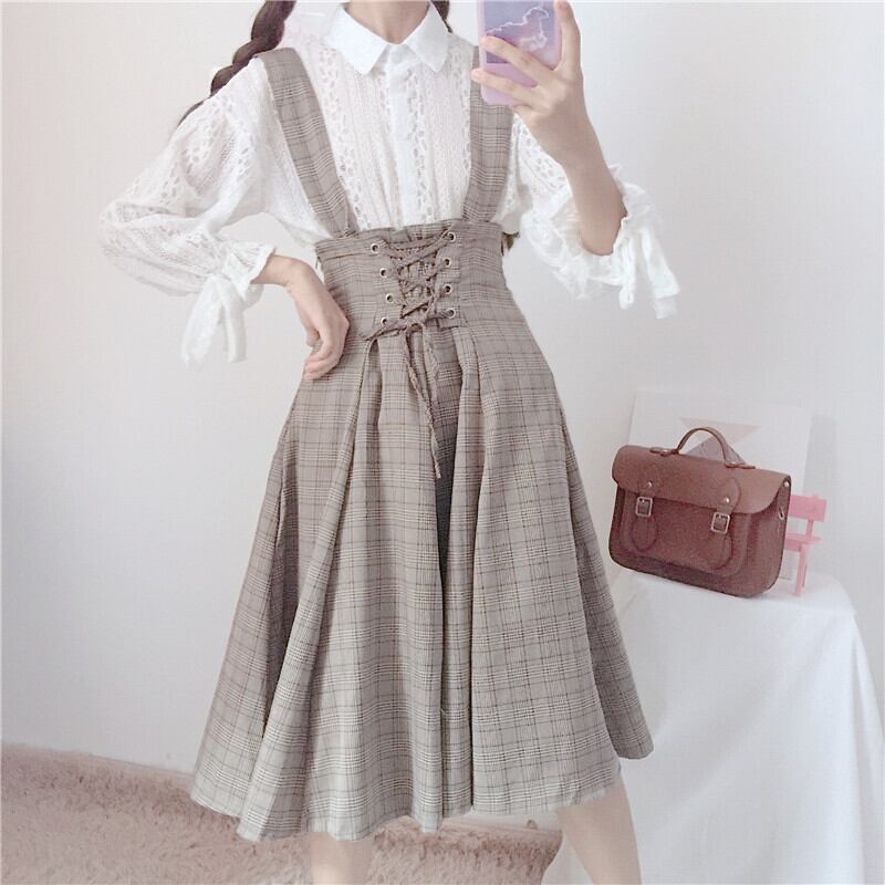 色:白いシャツ(ワンピース),ストラップチェック柄スカート(シングルピース)