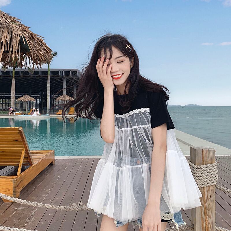 スタイルルーズメッシュ レース シースルー チュール オーガンジー半袖 半そでスリーブ 袖Tシャツ ショート ショート丈 ミニ ミニ丈 ハーフスリーブ ステッチ ガーリー5964186 | nice import1