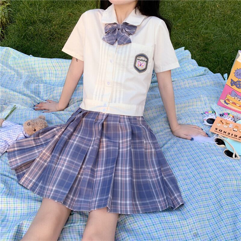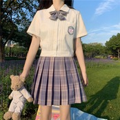 色:紫のチェック柄スカートのワンピース,シャツ一枚,襟の花のワンピース