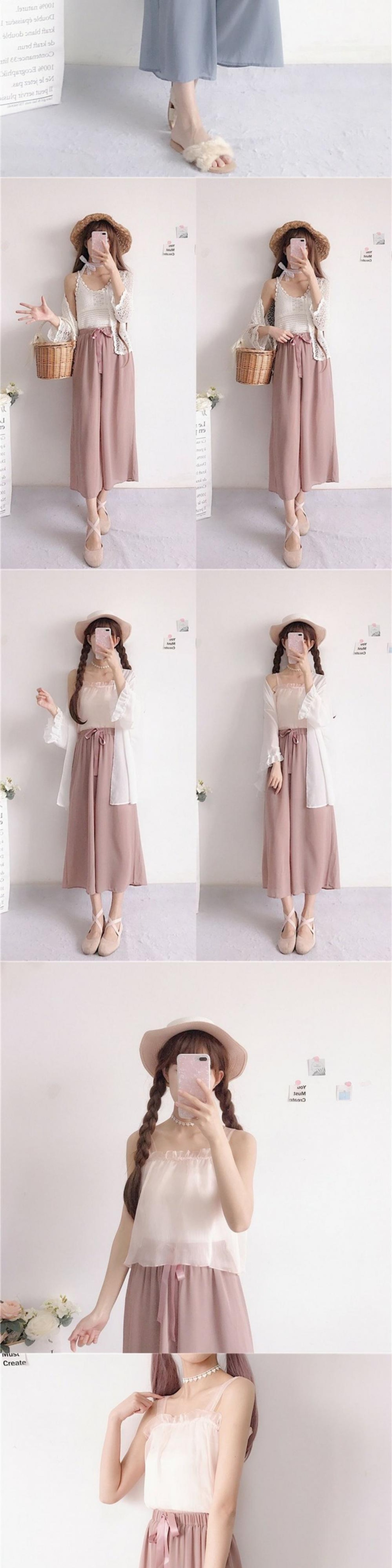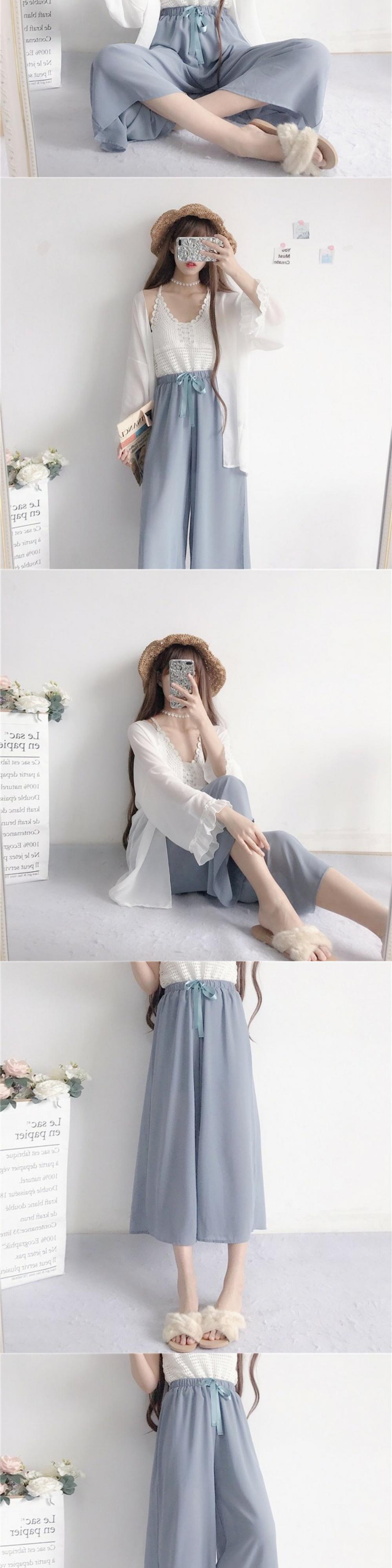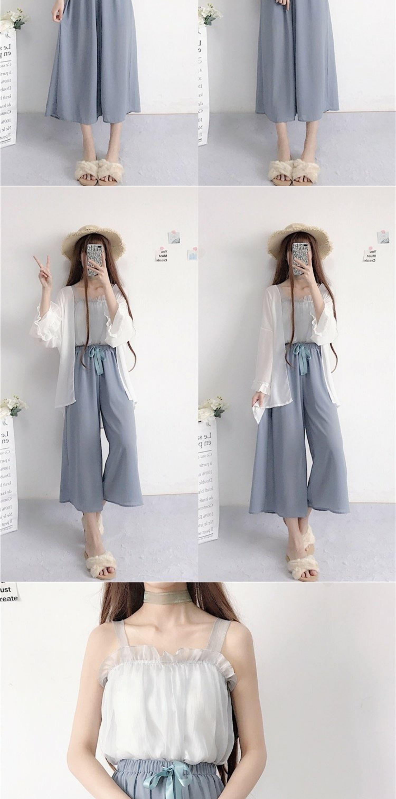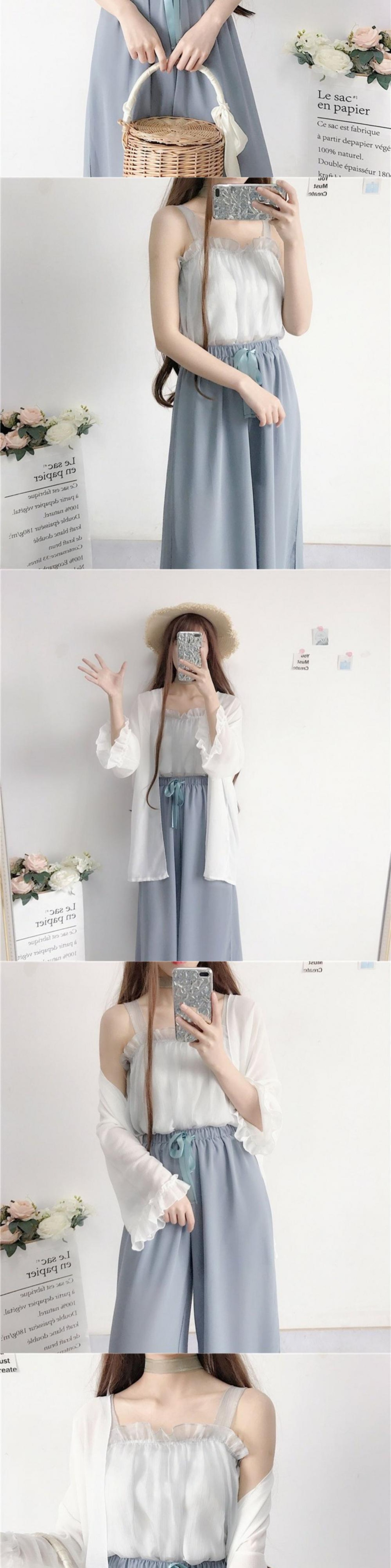 色:グレーのシフォンベストのワンピース,アプリコットピンクシフォンベストのワンピース,ニットサスペンダー1枚,シフォンの日焼け防止服1枚,ニットショールのワンピース,青いパンツワンピース,濃いピンクのパンツのワンピース