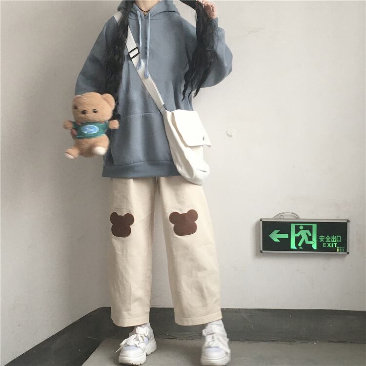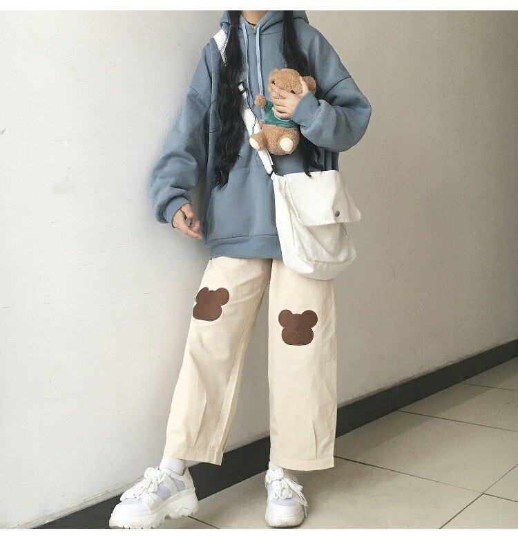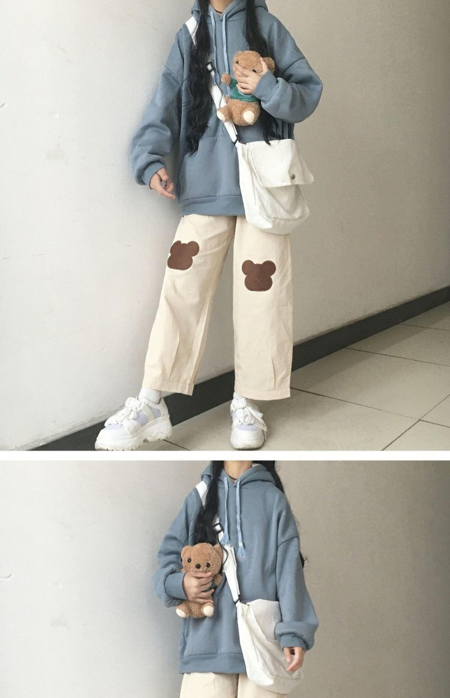 色:青いセーター,黒いズボン,アプリコットパンツ