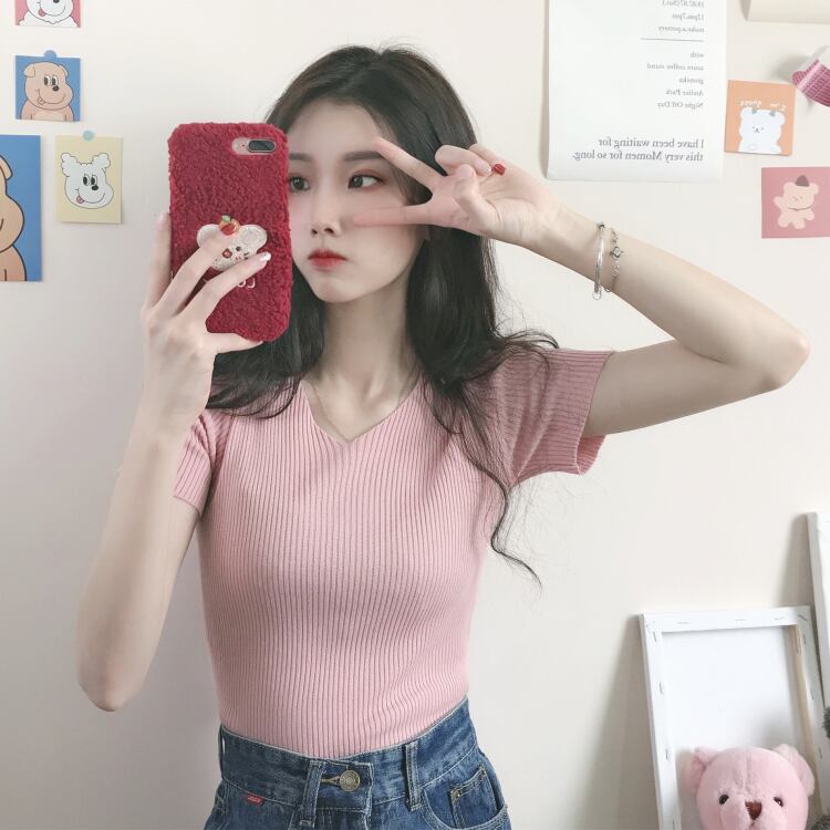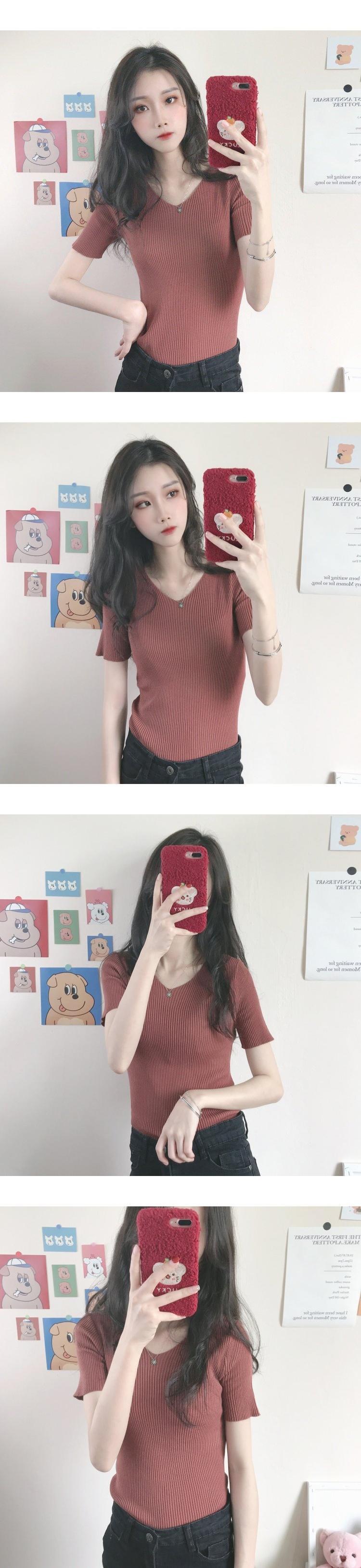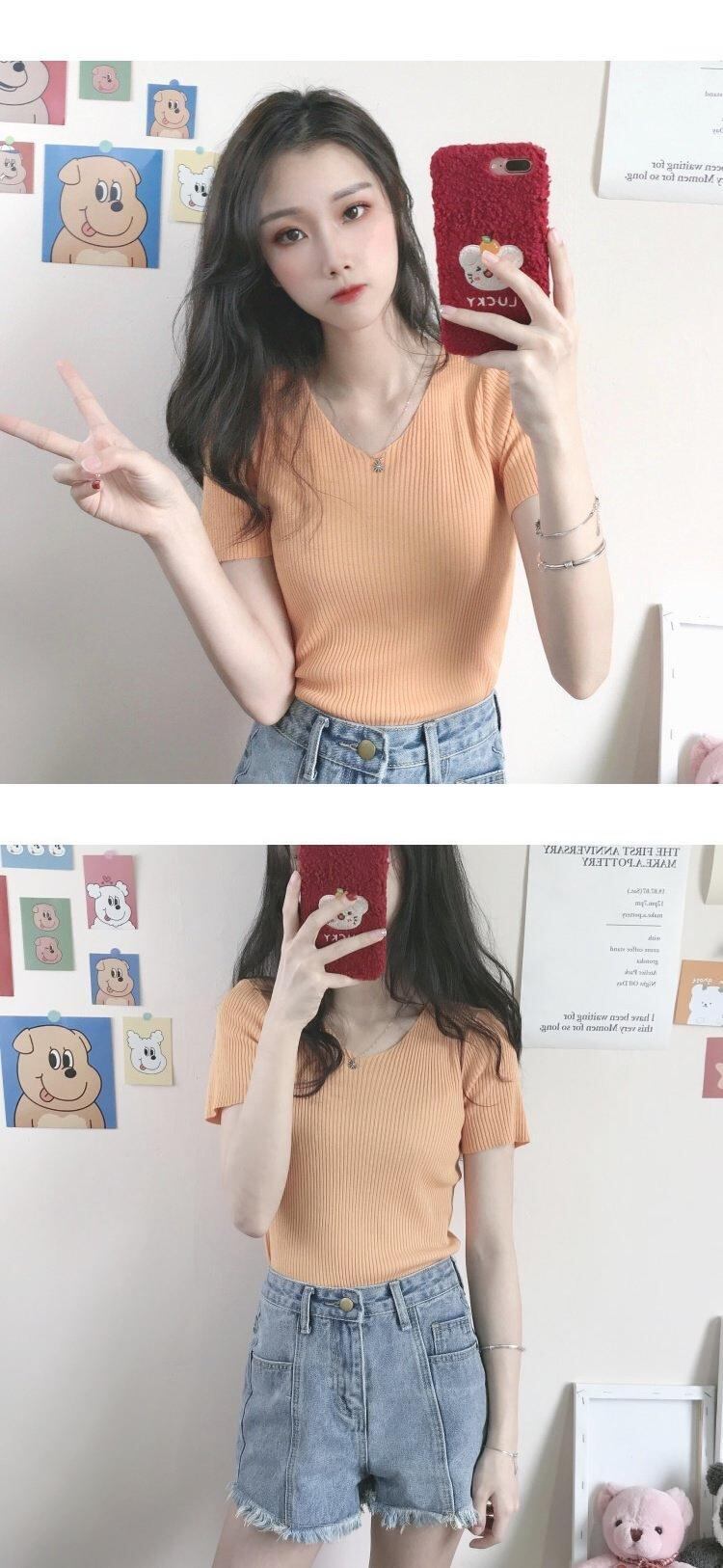シャツ トップス 薄手ソリッド カラーレッド 赤VネックニットTシャツ ショート ショート丈 ミニ ミニ丈 ソリッドカラー 女性 レディース ガーリー99868611351 | nice import1