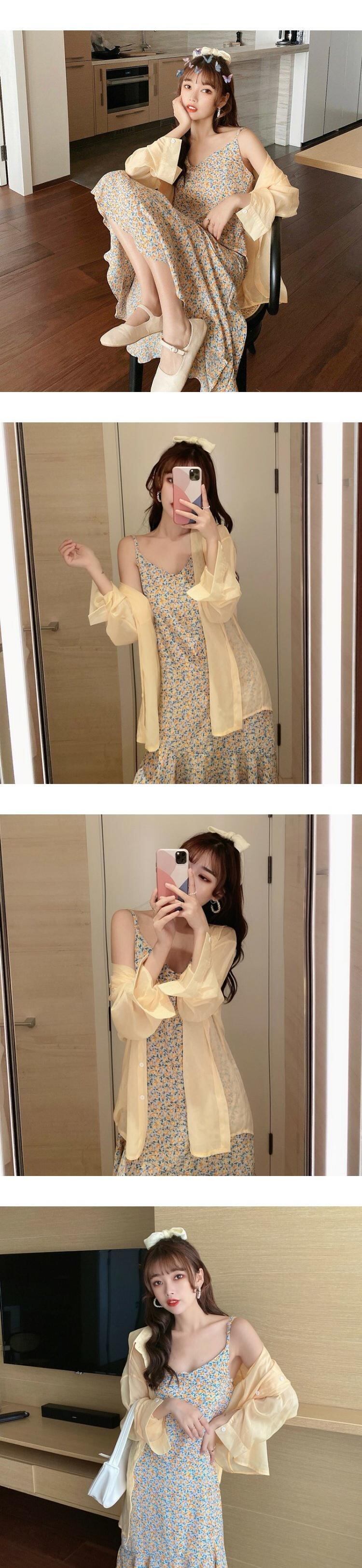 色:パープルカーディガン,薄黄色のカーディガン,パープルホルタードレス,黄色のサスペンダースカート