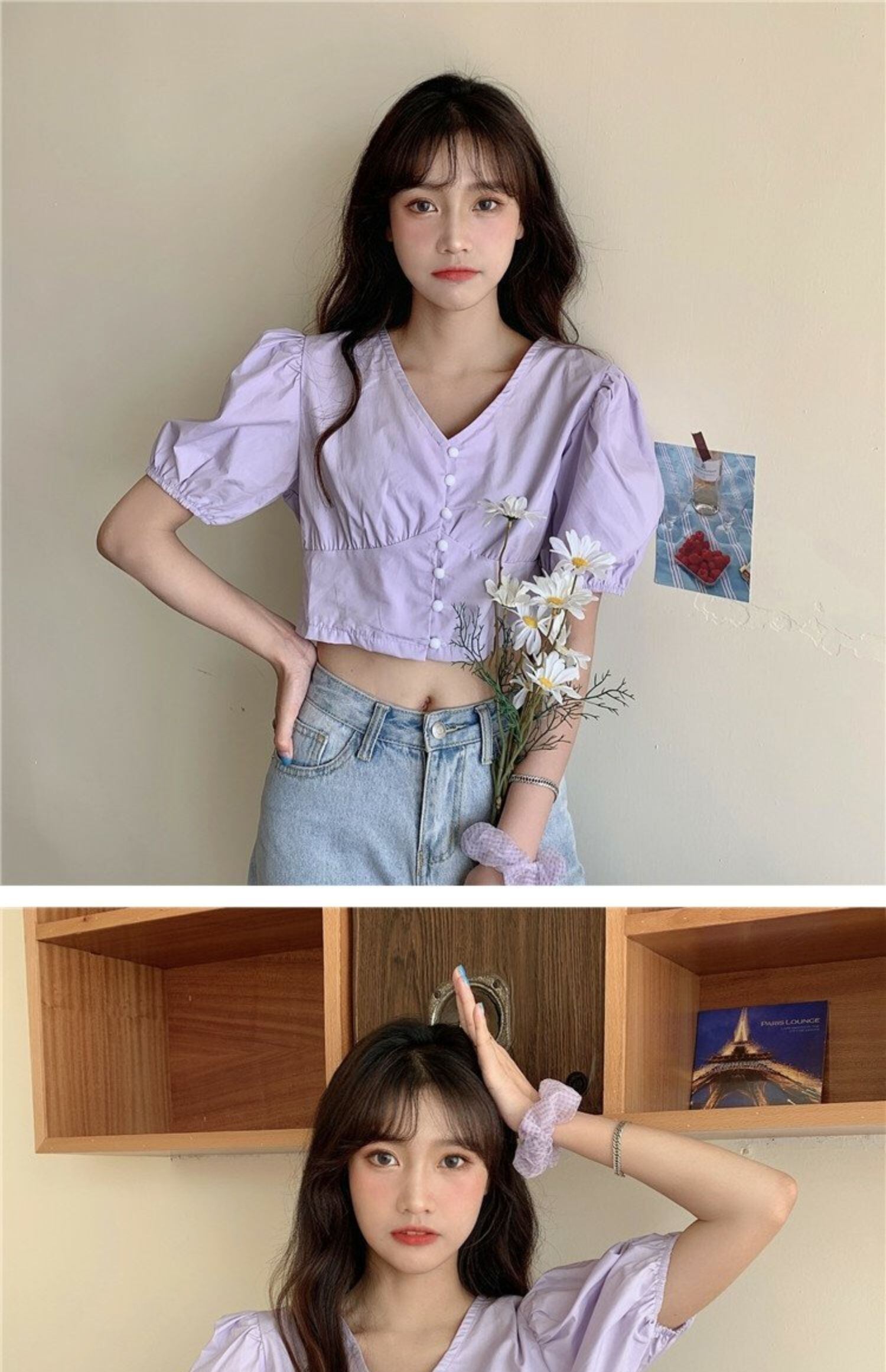スリーブ 袖トップス ショート ショート丈 ミニ ミニ丈Vネック半袖 半そでウエストシャツ ハーフスリーブ パープル 女性 レディース ガーリー62416277739
