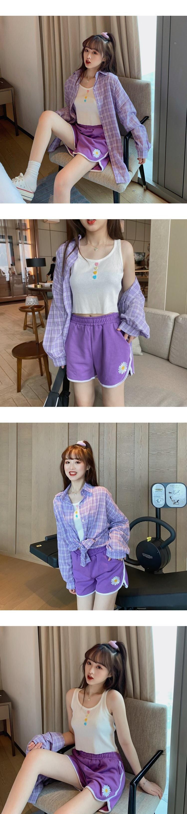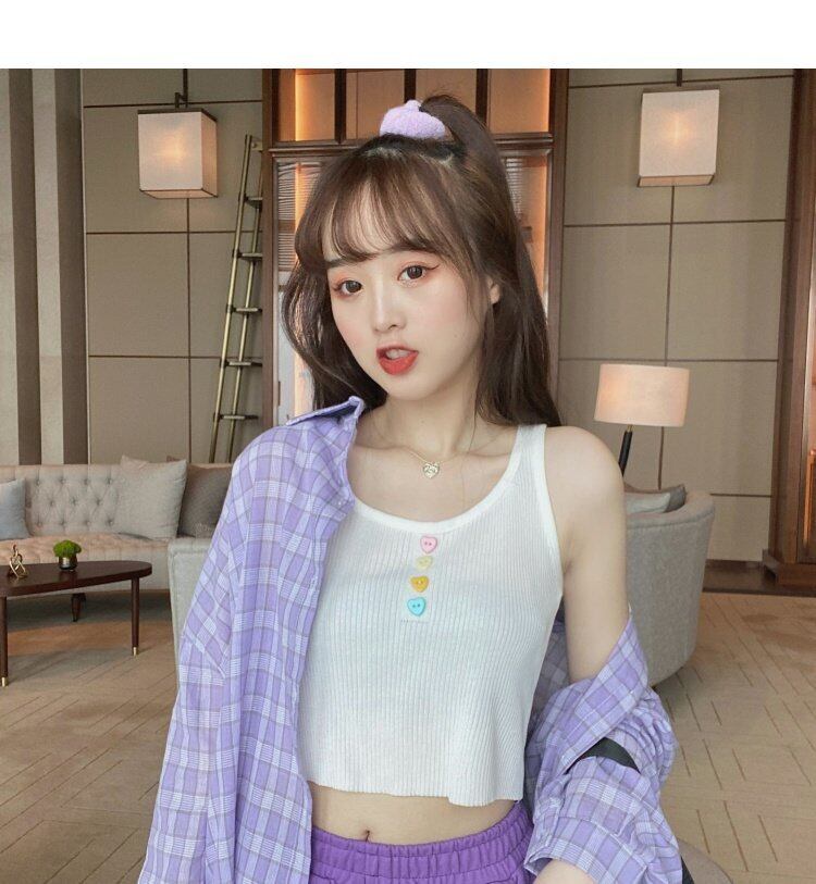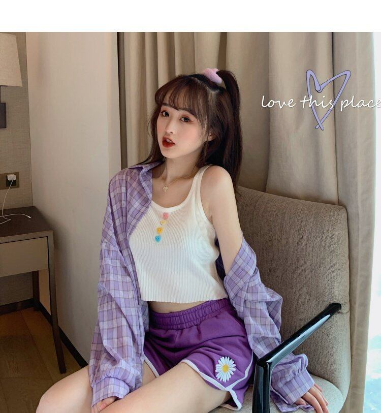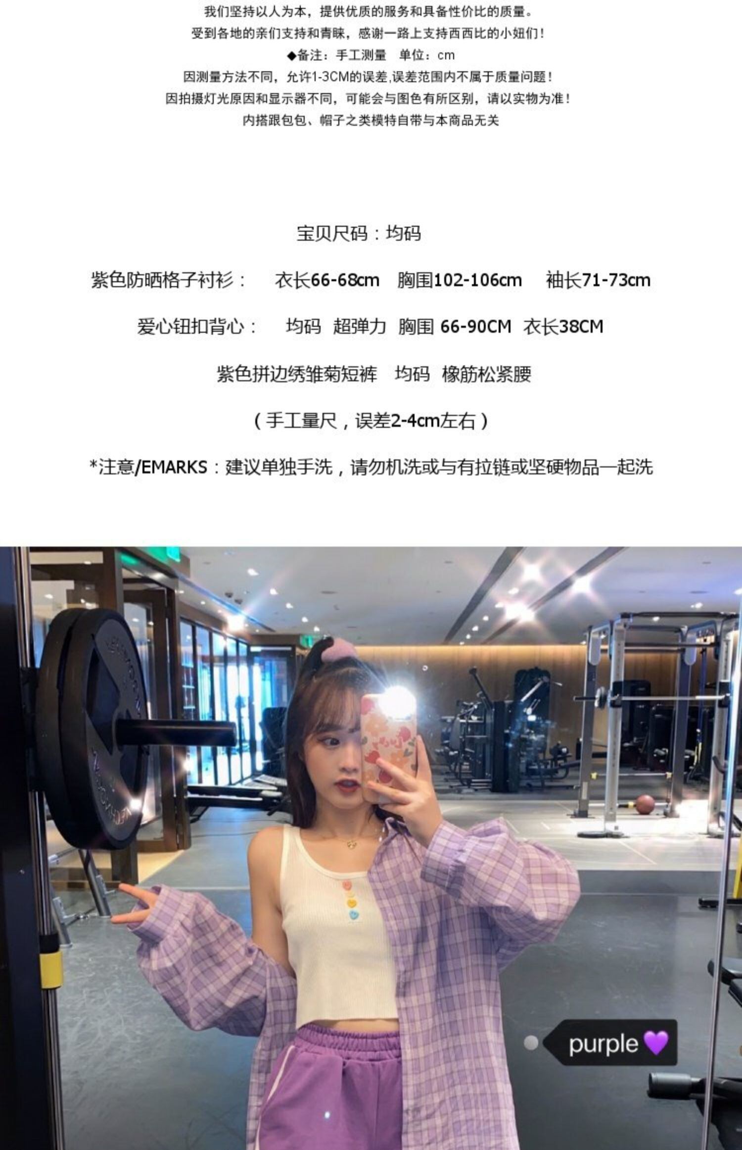 色:ライトパープルチェックシャツ,ラブボタンホワイトベスト,パープルショーツ