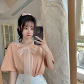 トップス メッシュ レース シースルー チュール オーガンジーリボンカラーTシャツ ショート ショート丈 ミニ ミニ丈 女性 レディース ガーリー45738748874