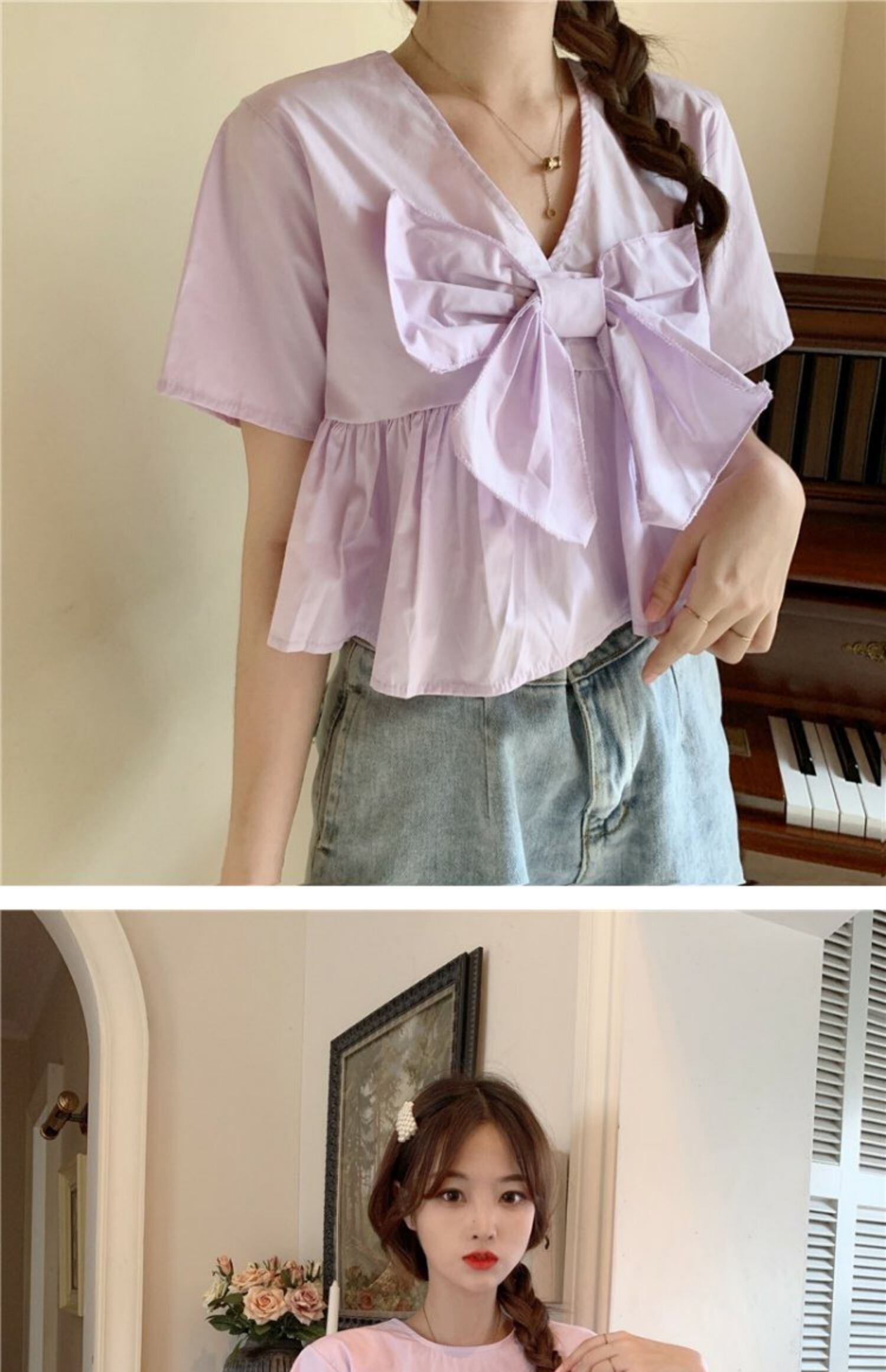 シャツ リボンショート ショート丈 ミニ ミニ丈Vネックトップス かわいい 可愛い ガーリー 大人可愛い 大人かわいい フェミニン 大人ガーリー パープル 女性 レディース ガーリー30040397467 | nice import1