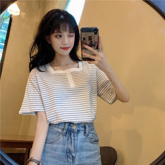 ルーズストライプTシャツ カラー半袖 半そでスリーブ 袖トップス ショート ショート丈 ミニ ミニ丈 ハーフスリーブ パープル スクウェア スクエア 女性 レディース ガーリー96405050429 | nice import1