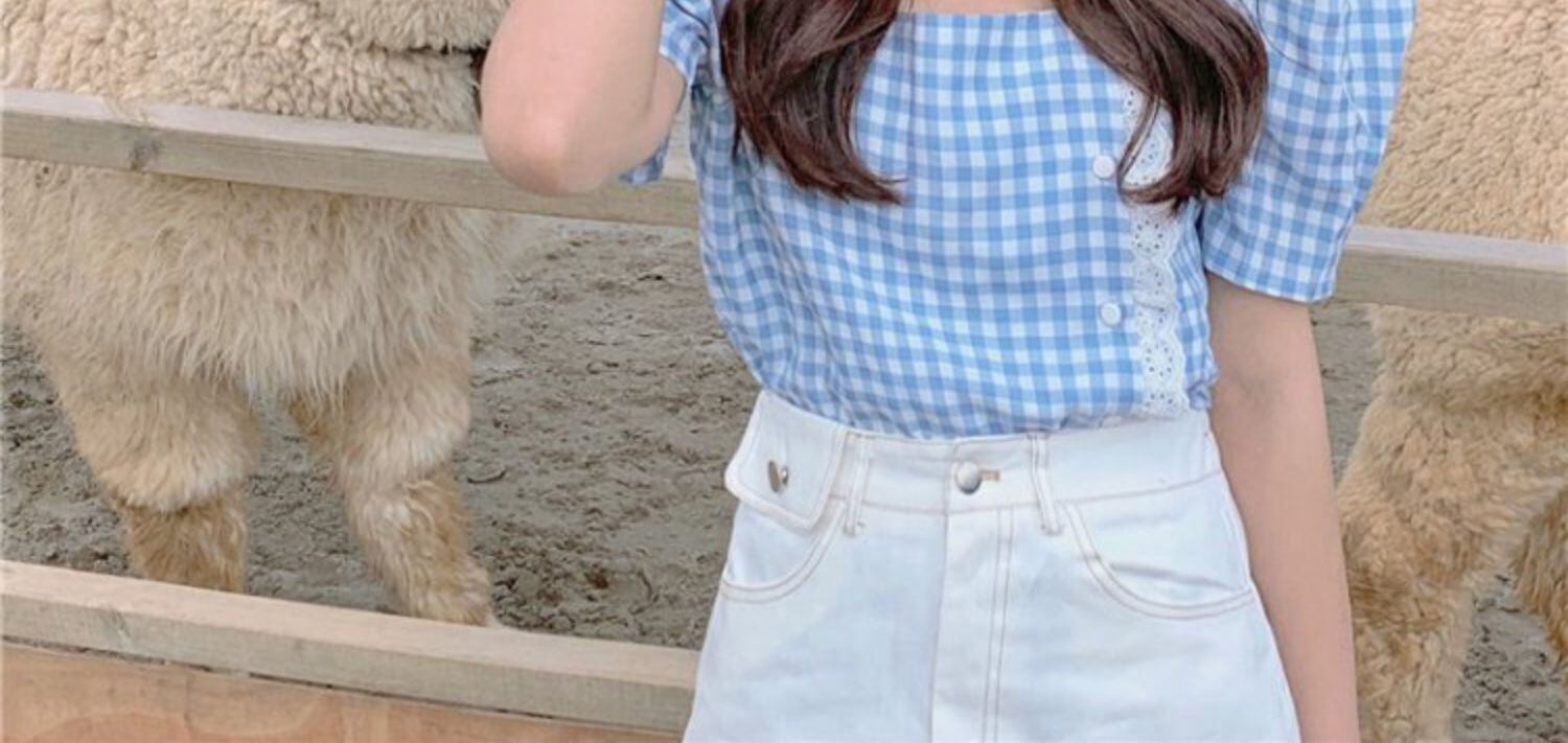 ブルー 青格子柄 チェックシャツ スリーブ 袖カラートップス 半袖 半そで ショート ショート丈 ミニ ミニ丈 ハーフスリーブ スクウェア スクエア 女性 レディース ガーリー77465631185 | nice import1