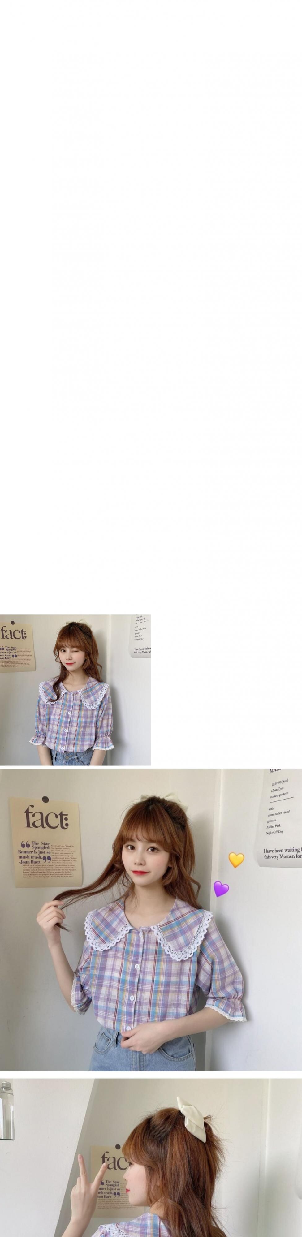 格子柄 チェックシャツ スタイルルーズカラー半袖 半そでスリーブ 袖トップス ショート ショート丈 ミニ ミニ丈 ハーフスリーブ パープル 女性 レディース ガーリー70396773771 | nice import1