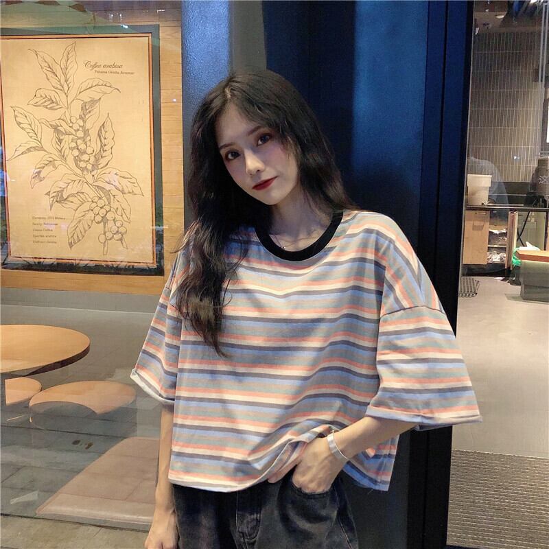 ラウンドネックプルオーバー 半袖 半そでスリーブ 袖ルーズストライプシャツ Tシャツ レディース ショート ショート丈 ミニ ミニ丈 ハーフスリーブ 女性 レディース ゆめかわ61903100618 | nice import1