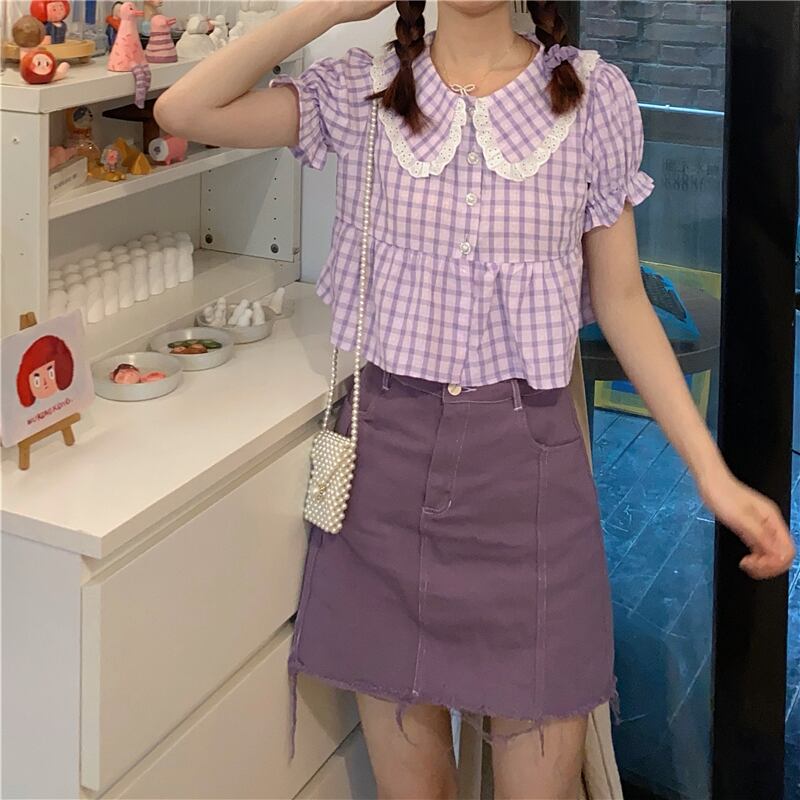 カラー格子柄 チェックシャツ トップス ハイウエストウエストスカート レディース ハイウェスト ショート ショート丈 ミニ ミニ丈 かわいい 可愛い ガーリー 大人可愛い 大人かわいい フェミニン 大人ガーリー パープル 女性 レディース ゆめかわ14179925902 | nice import1