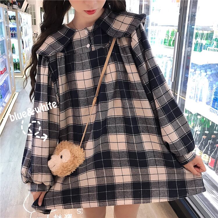 格子柄 チェックネイビー 紺色カラードレス ワンピースルーズウエスト薄手スカート ランタンスリーブ バルーンスリーブ ランタン袖 バルーン袖 かわいい 可愛い ガーリー 大人可愛い 大人かわいい フェミニン 大人ガーリー 女性 レディース ゆめかわ77888549696 | nice import1
