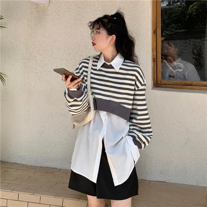 色:ライトグレーのセーターシングル,白シャツワンピース