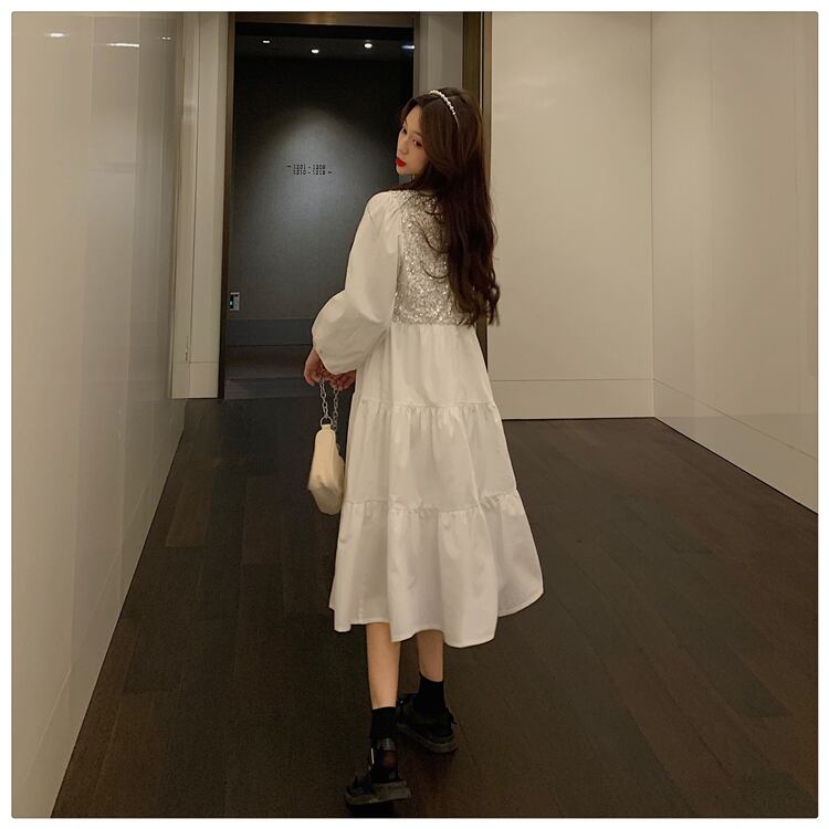 ラウンドネックスリーブ 袖ドレス ワンピーススパンコールホワイト 白スカート かわいい 可愛い ガーリー 大人可愛い 大人かわいい フェミニン 大人ガーリー ステッチ 女性 レディース ゆめかわ27425684475 | nice import1