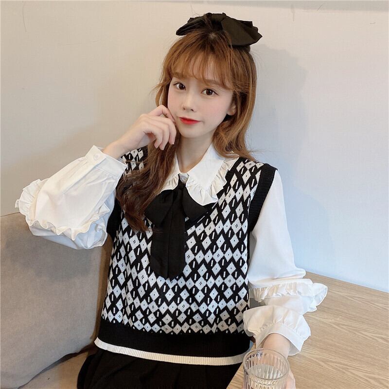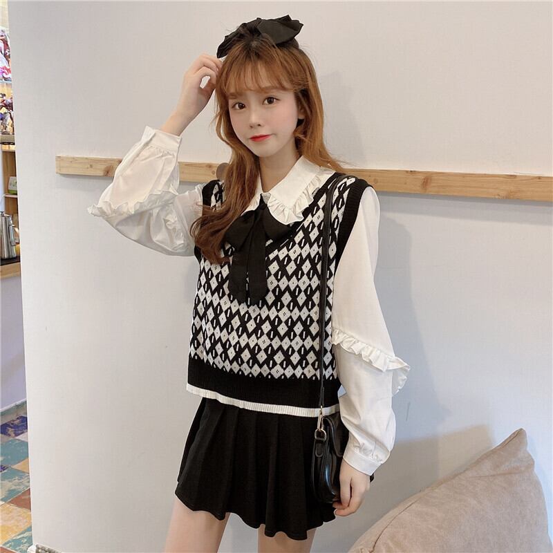 色:白のシャツ,ブラックベストワンピース