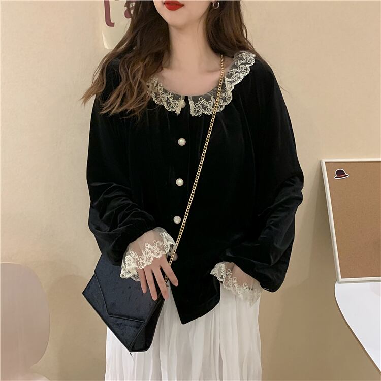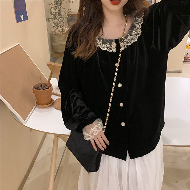スタンダードレースベルベットブラック 黒シャツ スタイル ロング マキシロング丈 マキシ丈 レトロ かわいい 可愛い ガーリー 大人可愛い 大人かわいい フェミニン 大人ガーリー ステッチ 女性 レディース ゆめかわ27775778904 | nice import1