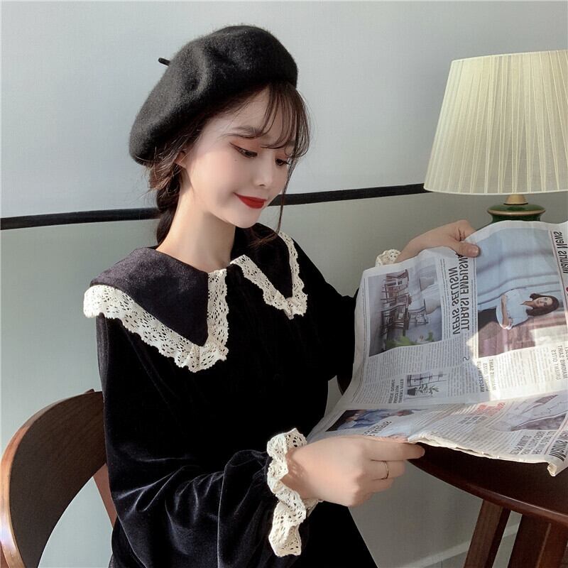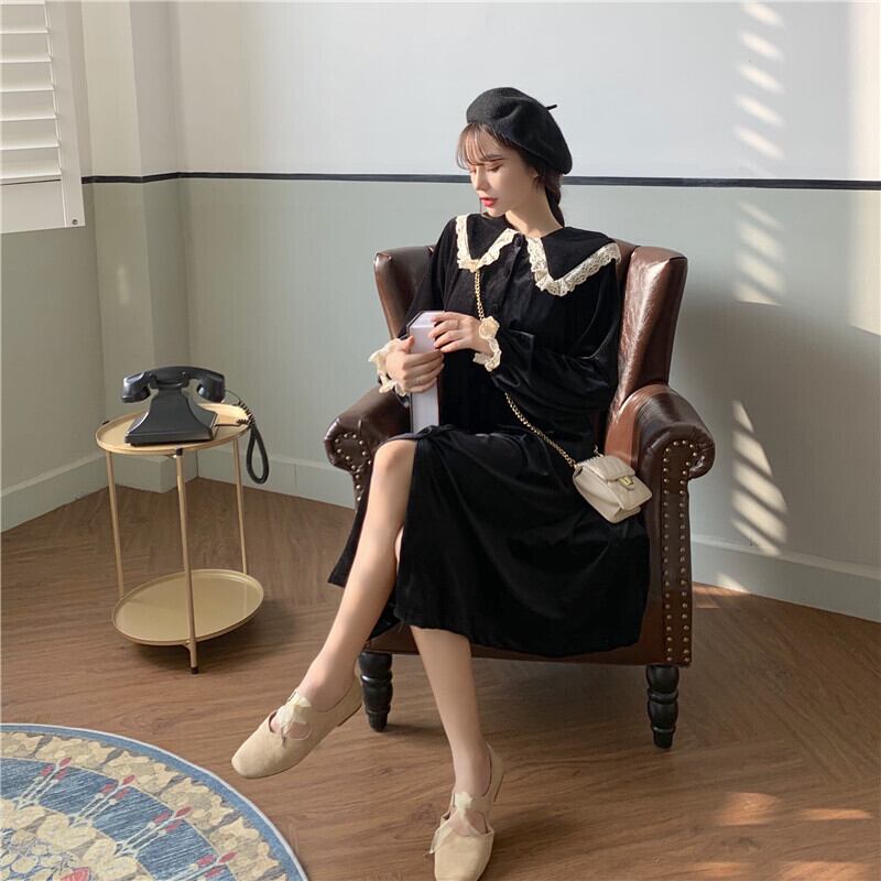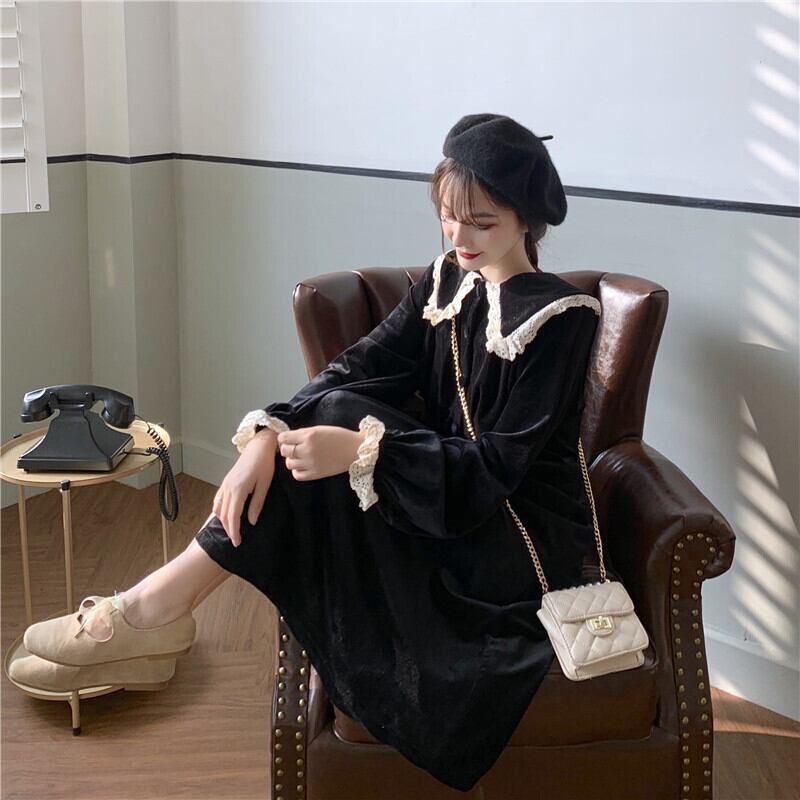 スタンダードレースサイドカラー長袖 長そでスリーブ 袖ブラック 黒ベルベットハイウエストウエストドレス ワンピース ハイウェスト ロング マキシロング丈 マキシ丈 レトロ 女性 レディース ゆめかわ79797426042 | nice import1
