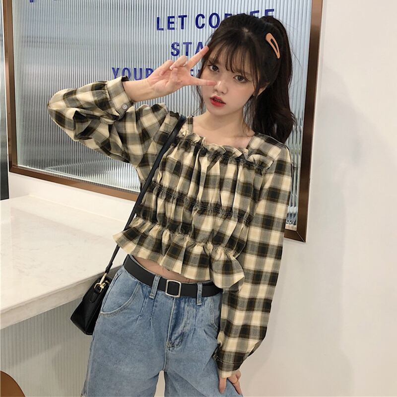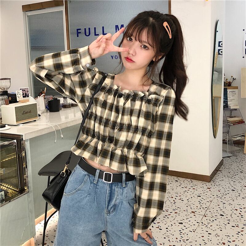 スタンダードカラー格子柄 チェックトップス レディースプリーツショート ショート丈 ミニ ミニ丈シャツ ロング マキシロング丈 マキシ丈 レトロ スクウェア スクエア 女性 レディース ゆめかわ52983553 | nice import1