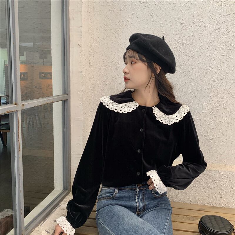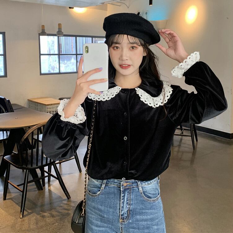 スタンダードレースベルベットシャツ ルーズ薄手ブラック 黒レディース レトロ かわいい 可愛い ガーリー 大人可愛い 大人かわいい フェミニン 大人ガーリー ステッチ 女性 レディース ゆめかわ96439297451 | nice import1