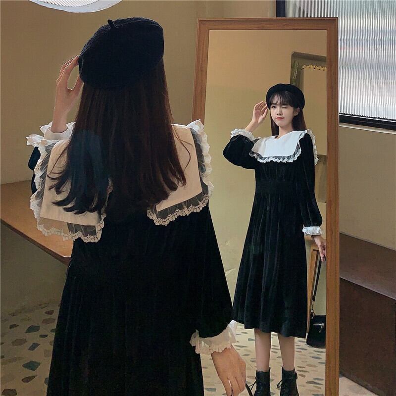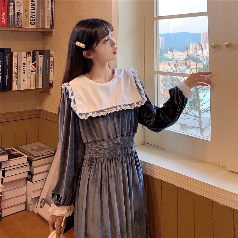スタンダードカラーレースネイビー 紺色ウエスト長袖 長そでスリーブ 袖ベルベットドレス ワンピース ロング マキシロング丈 マキシ丈 レトロ 女性 レディース ゆめかわ22900764165 | nice import1
