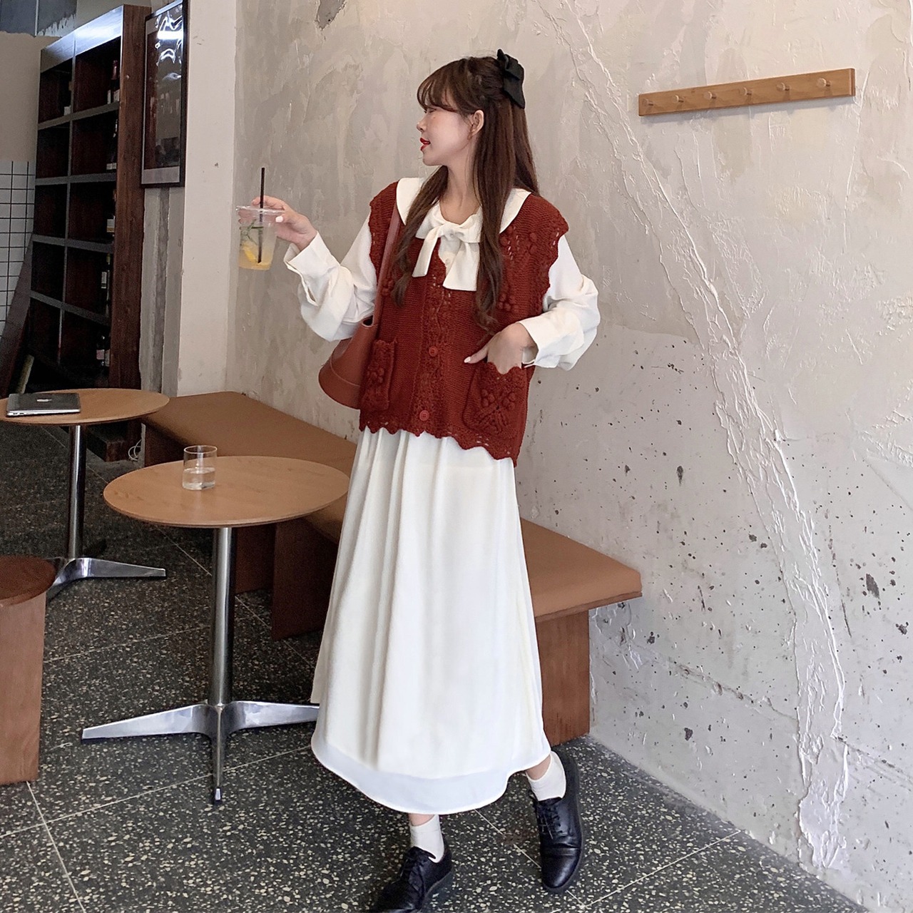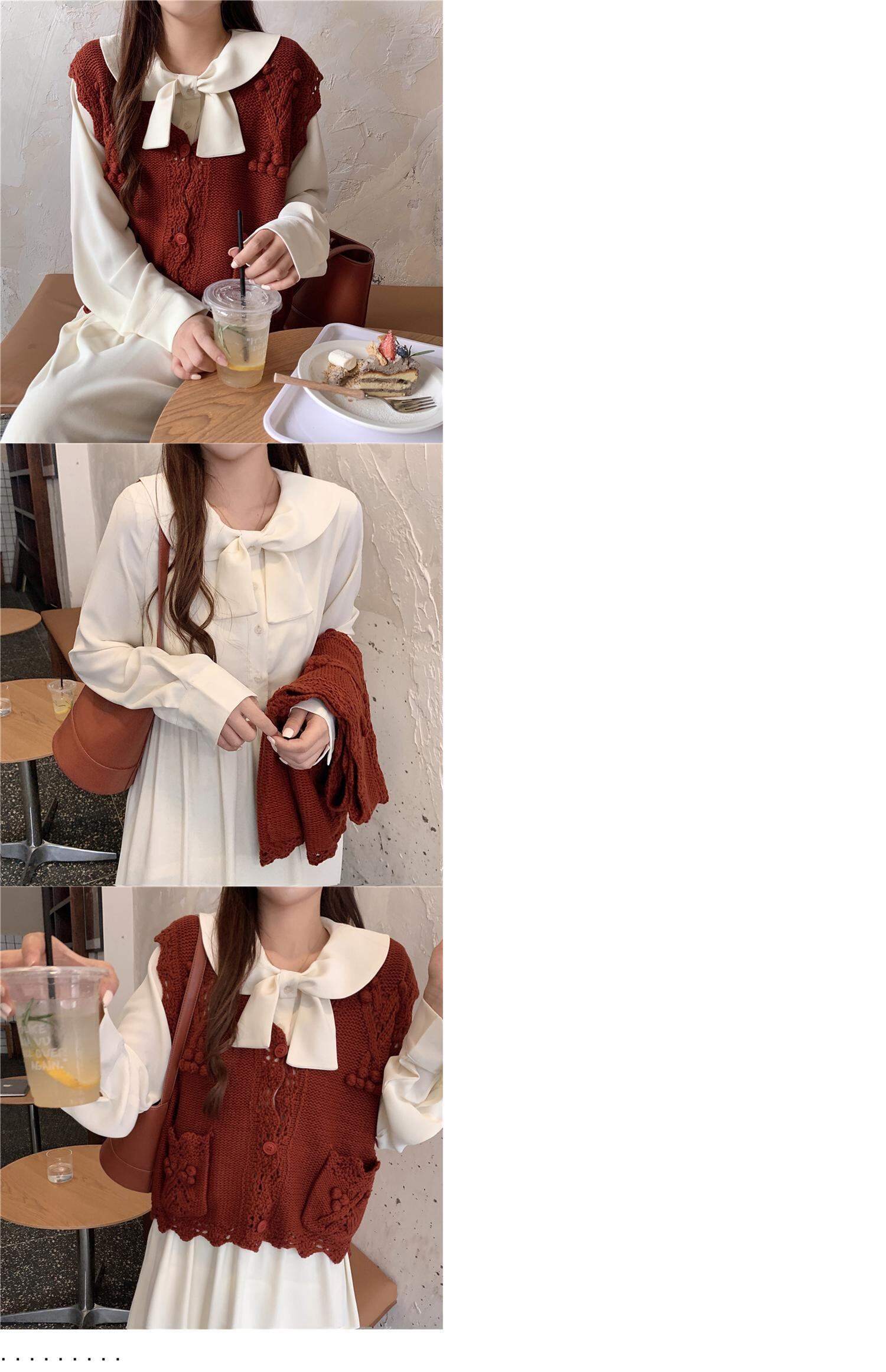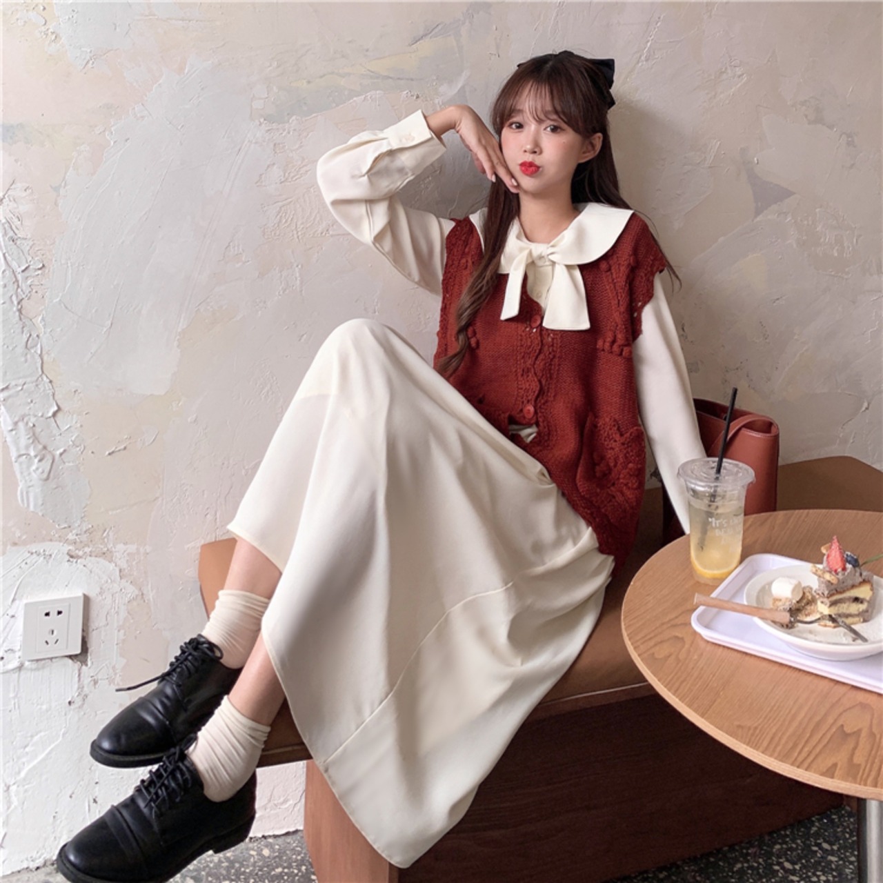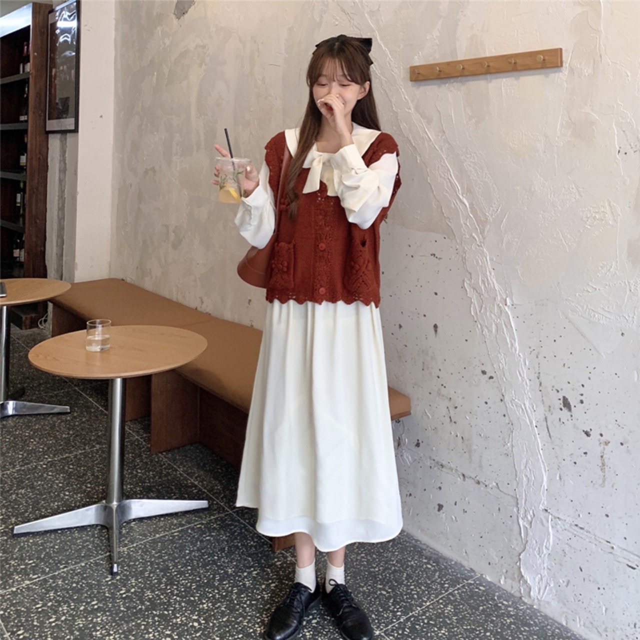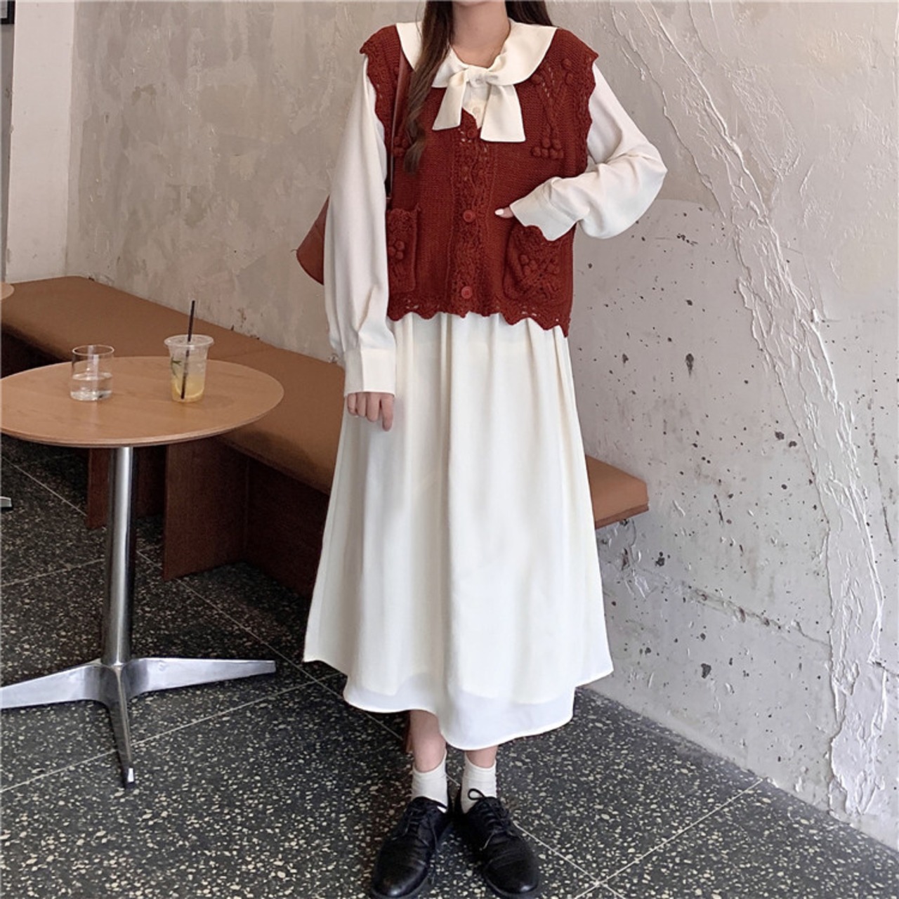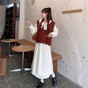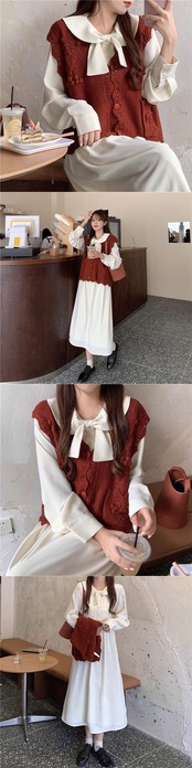 色:アプリコットワンピース,赤いベストシングル