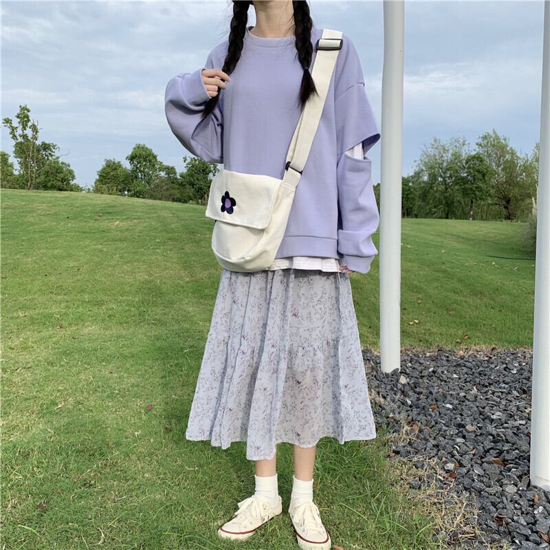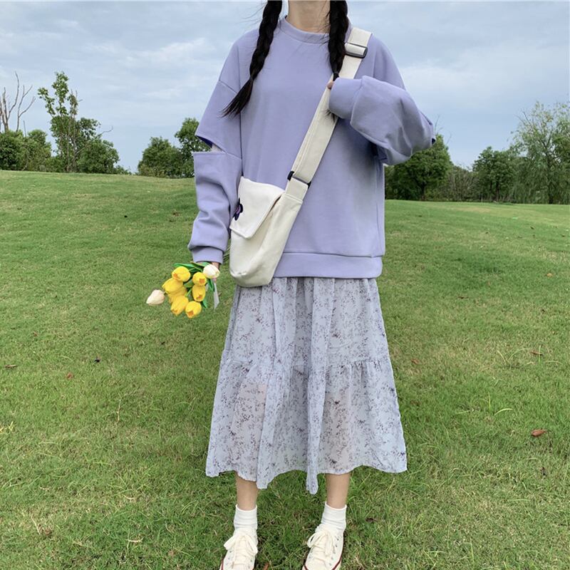 色:ホワイトロングTシングルピース,パープルセーターシングル,フローラルスカートワンピース