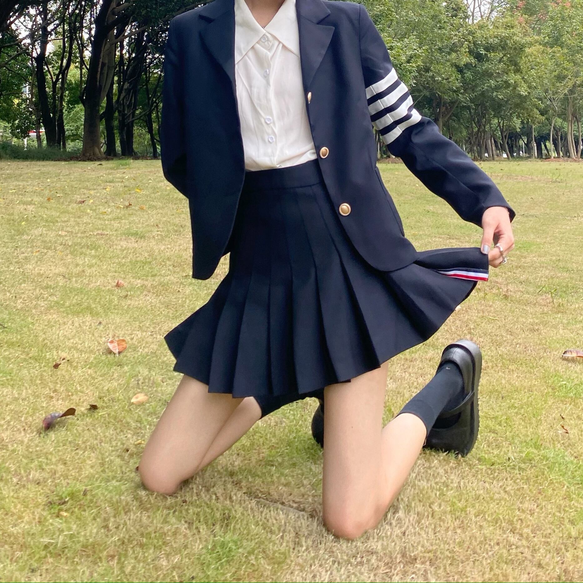 色:ネイビーブルージャケットシングル,紺のスカートワンピース
