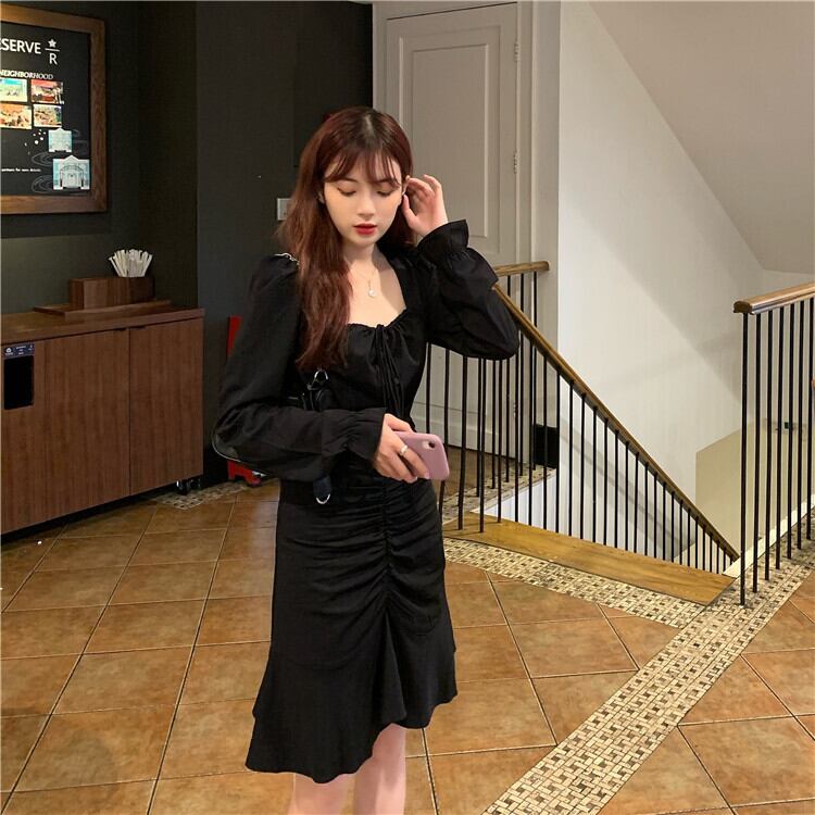 スタンダードカラースリムハイウエストウエスト長袖 長そでスリーブ 袖ブラック 黒ドレス ワンピース ハイウェスト ロング マキシロング丈 マキシ丈 レトロ スクウェア スクエア 女性 レディース ゆめかわ8401394692 | nice import1