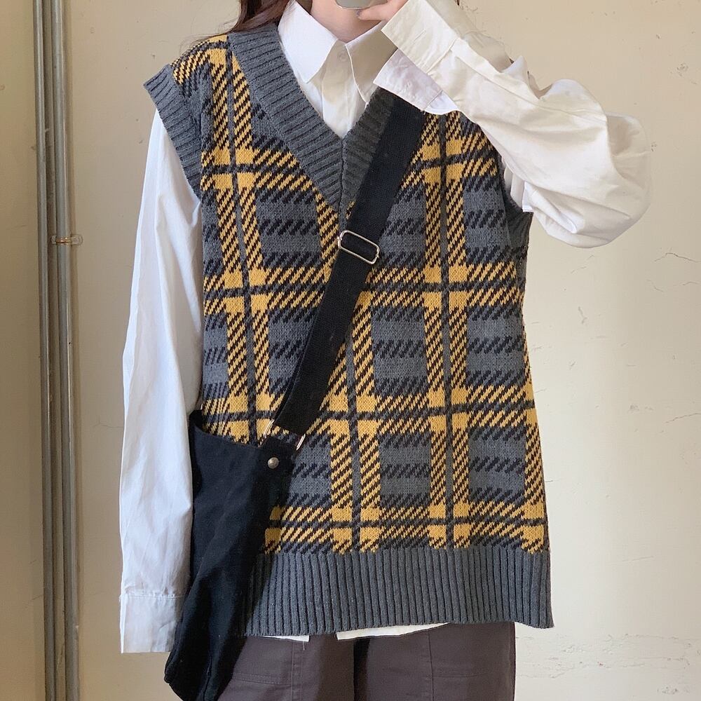 スタンダードニットレディースルーズ薄手格子柄 チェックVネック レトロ 女性 レディース ゆめかわ30493892521