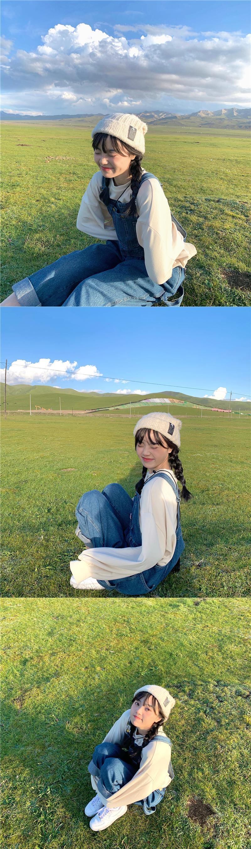色:ベージュベージュセーターワンピース,紺のオーバーオールワンピース