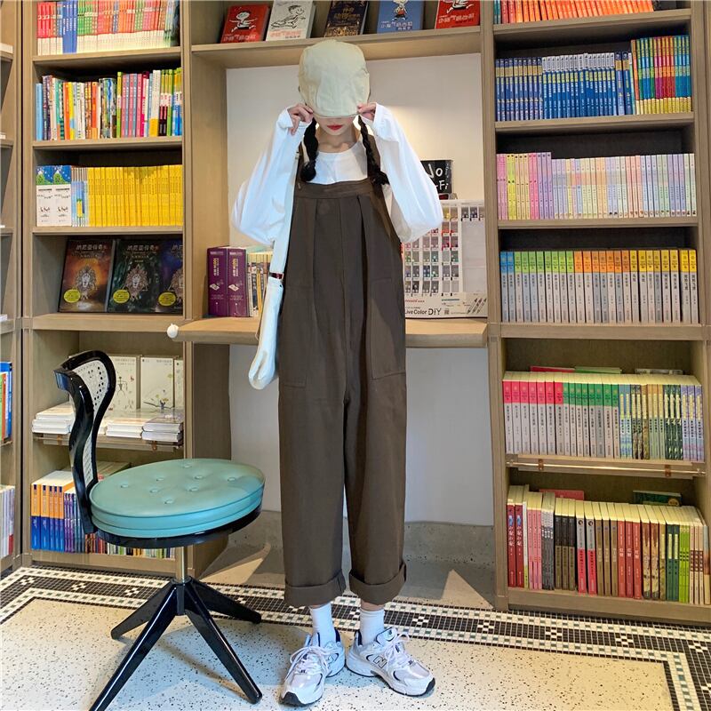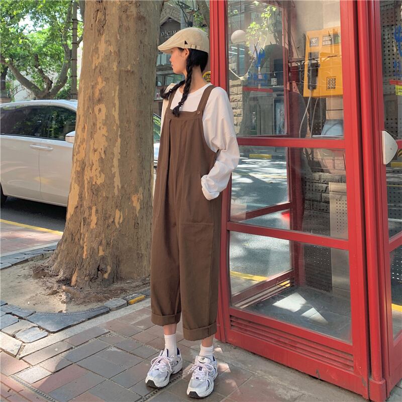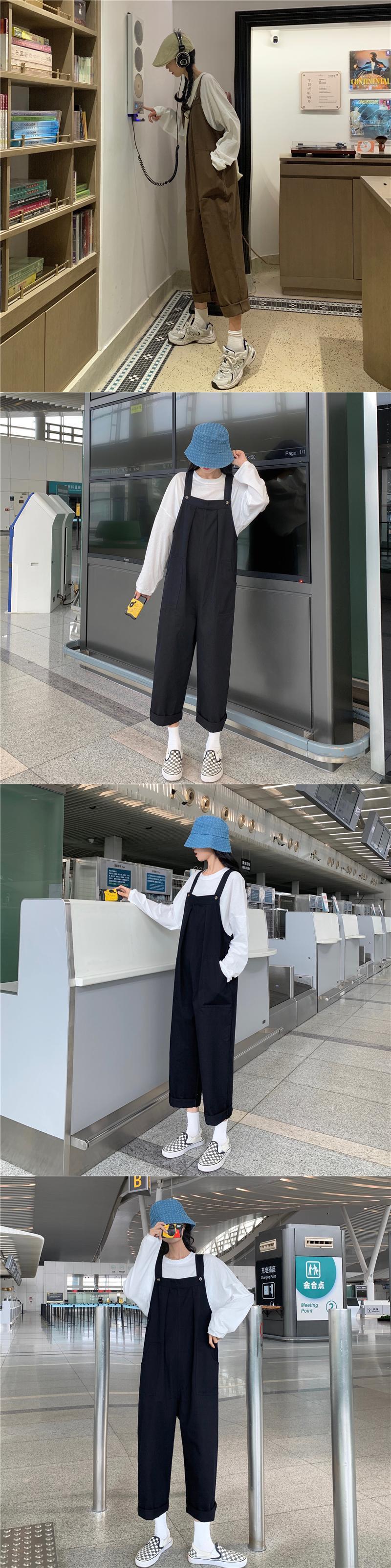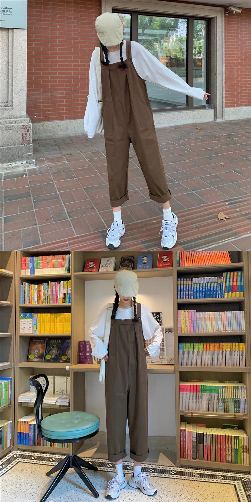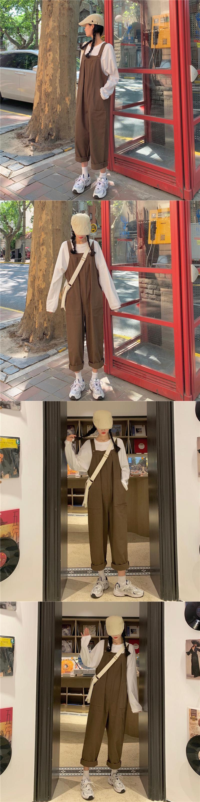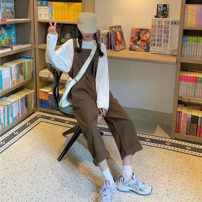 色:白いTシャツ,黒のオーバーオールワンピース,キャメルオーバーオールワンピース