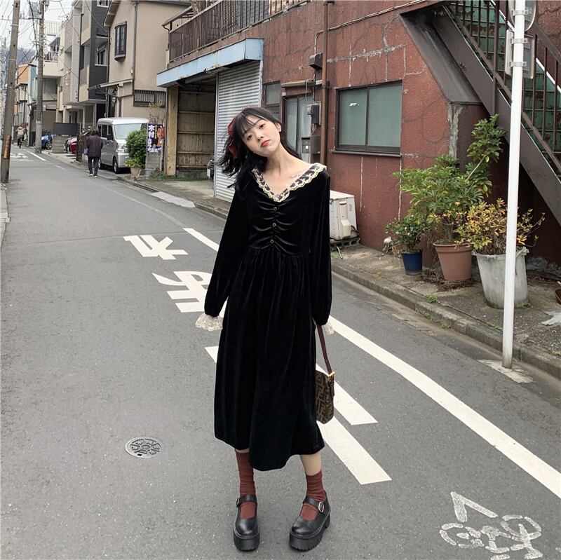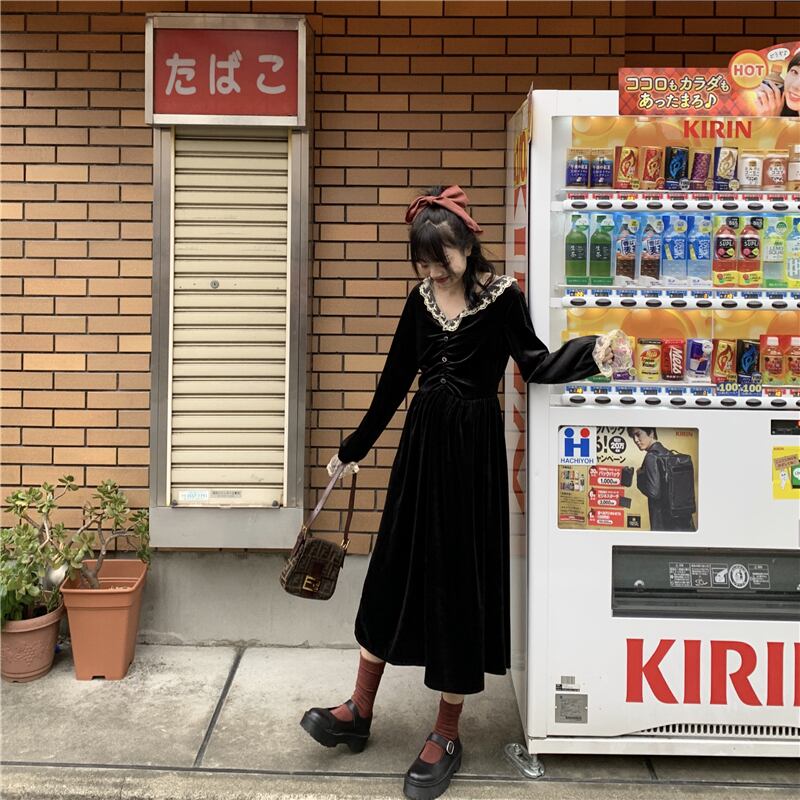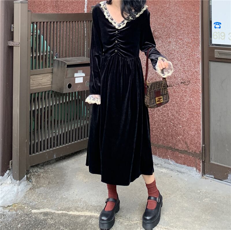 ベルベットブラック 黒ドレス ワンピースVネックレースロング マキシ ロング丈 マキシ丈 マキシロング丈 かわいい 可愛い ガーリー 大人可愛い 大人かわいい フェミニン 大人ガーリー ステッチ 女性 レディース ゆめかわ26024615411 | nice import1