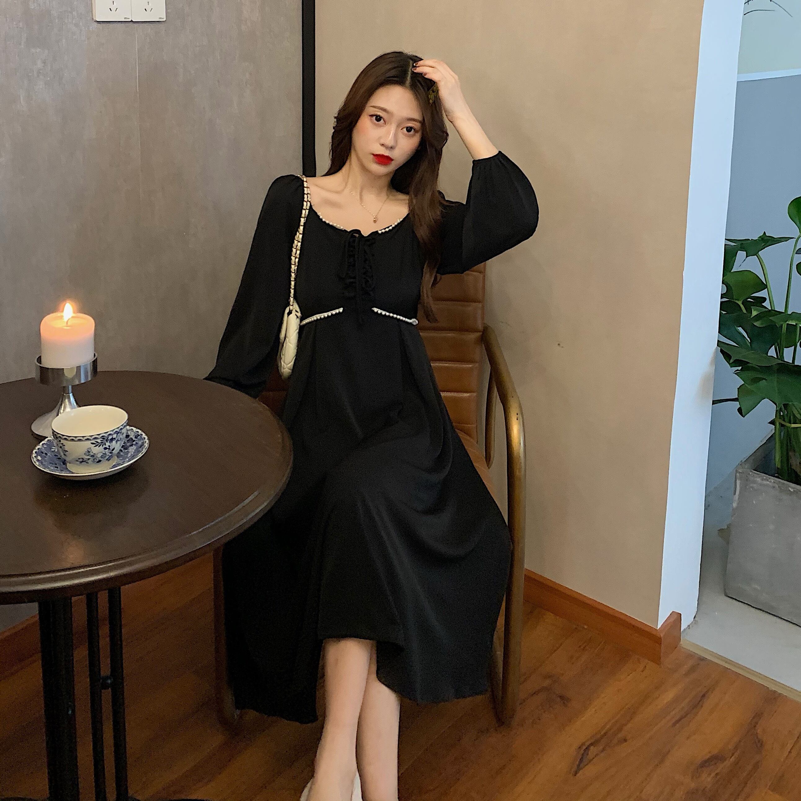 スタイルカラー長袖 長そでスリーブ 袖ストラップ ウエストブラック 黒ドレス ワンピース ロング マキシロング丈 マキシ丈 スクウェア スクエア 女性 レディース ゆめかわ33964457970 | nice import1