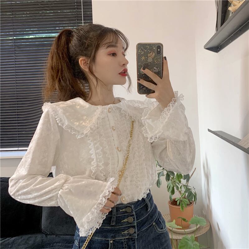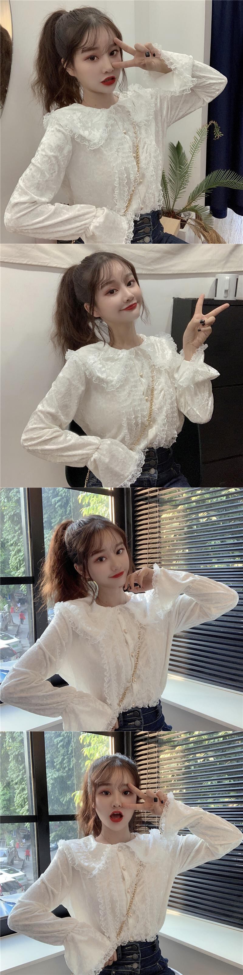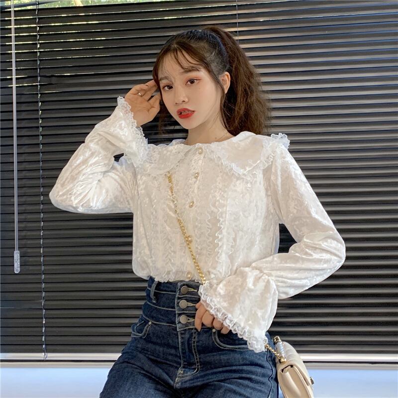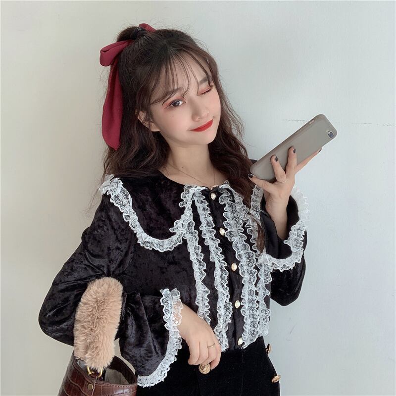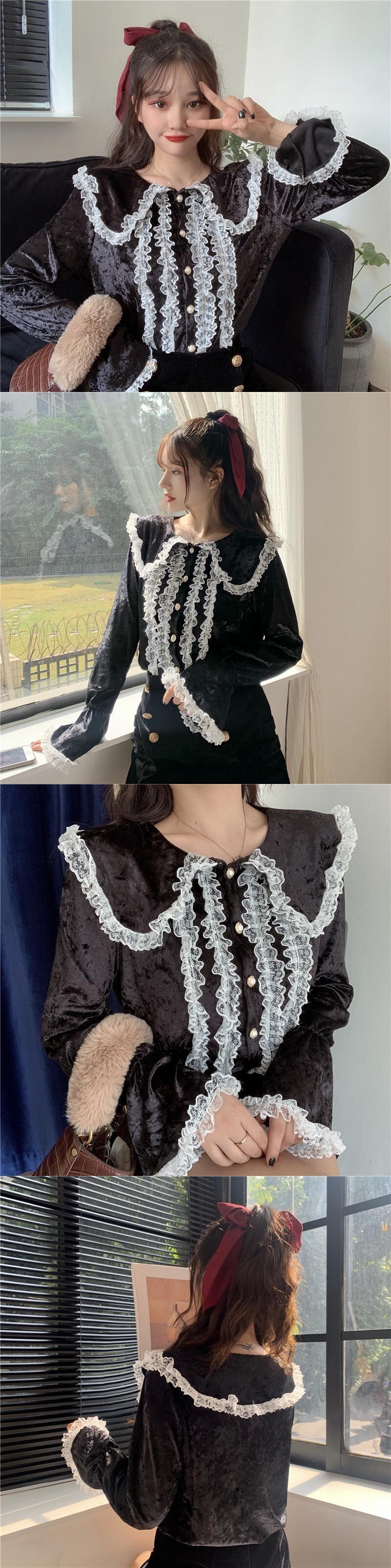 レースサイドスタンダードダークスリーブ 袖ベルベットシャツ ロング マキシロング丈 マキシ丈 レトロ かわいい 可愛い ガーリー 大人可愛い 大人かわいい フェミニン 大人ガーリー 女性 レディース ゆめかわ90352995724 | nice import1