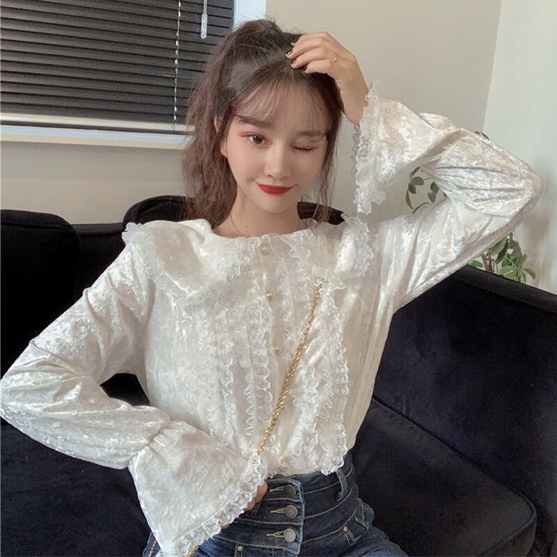 レースサイドスタンダードダークスリーブ 袖ベルベットシャツ ロング マキシロング丈 マキシ丈 レトロ かわいい 可愛い ガーリー 大人可愛い 大人かわいい フェミニン 大人ガーリー 女性 レディース ゆめかわ90352995724