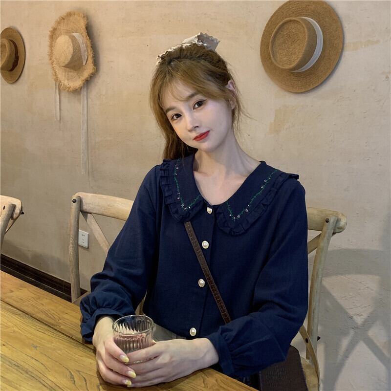 花柄 お花 フラワー刺繍ネイビー 紺色カラー長袖 長そでスリーブ 袖パールボタンシャツ ロング マキシロング丈 マキシ丈 かわいい 可愛い ガーリー 大人可愛い 大人かわいい フェミニン 大人ガーリー 真珠 女性 レディース ゆめかわ93819997633 | nice import1