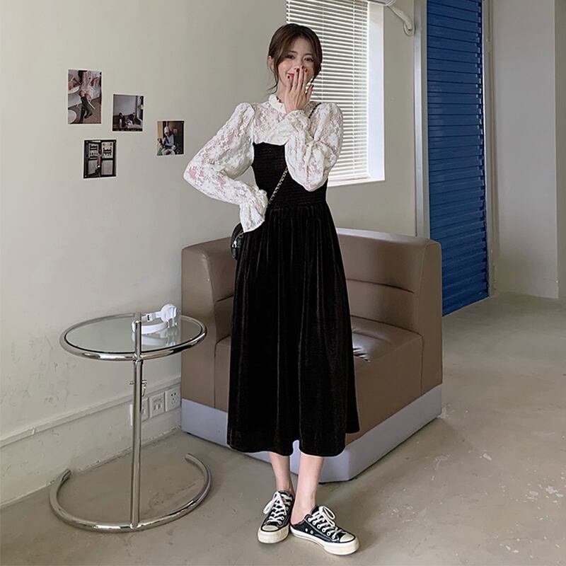 ドレス ワンピースラウンドネックレースゴールド 金色ベルベットスカート ロング マキシロング丈 マキシ丈 かわいい 可愛い ガーリー 大人可愛い 大人かわいい フェミニン 大人ガーリー ステッチ 女性 レディース ゆめかわ9590043393 | nice import1