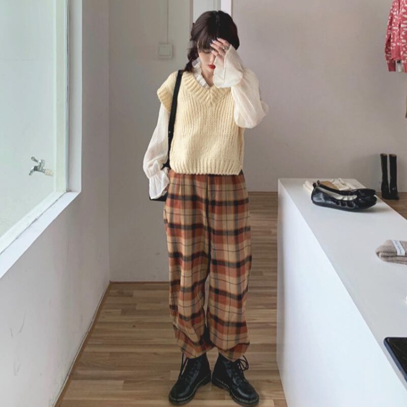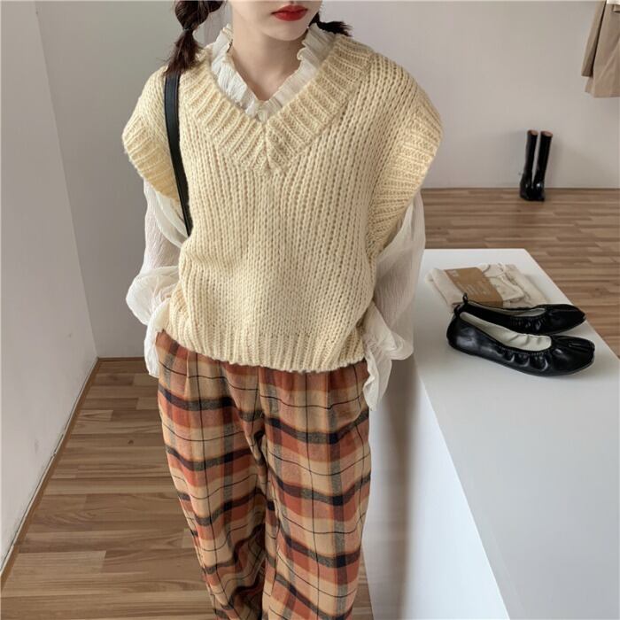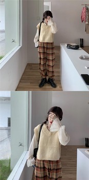 色:ボトミングシャツ,ニットベストシングルピース,チェック柄パンツワンピース