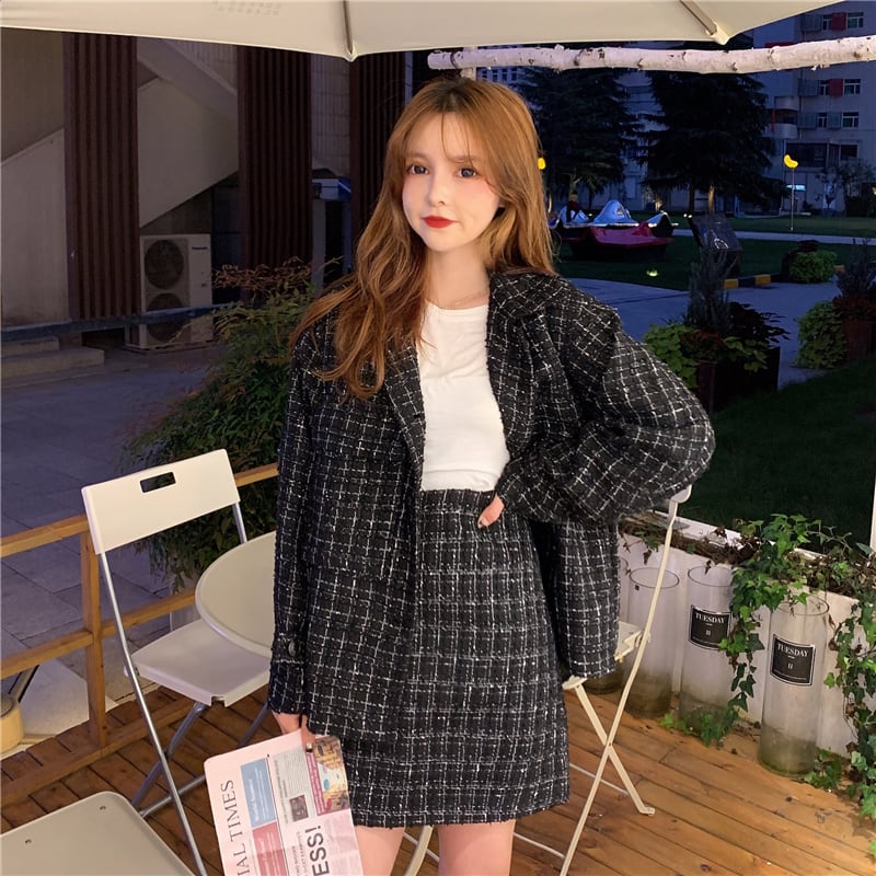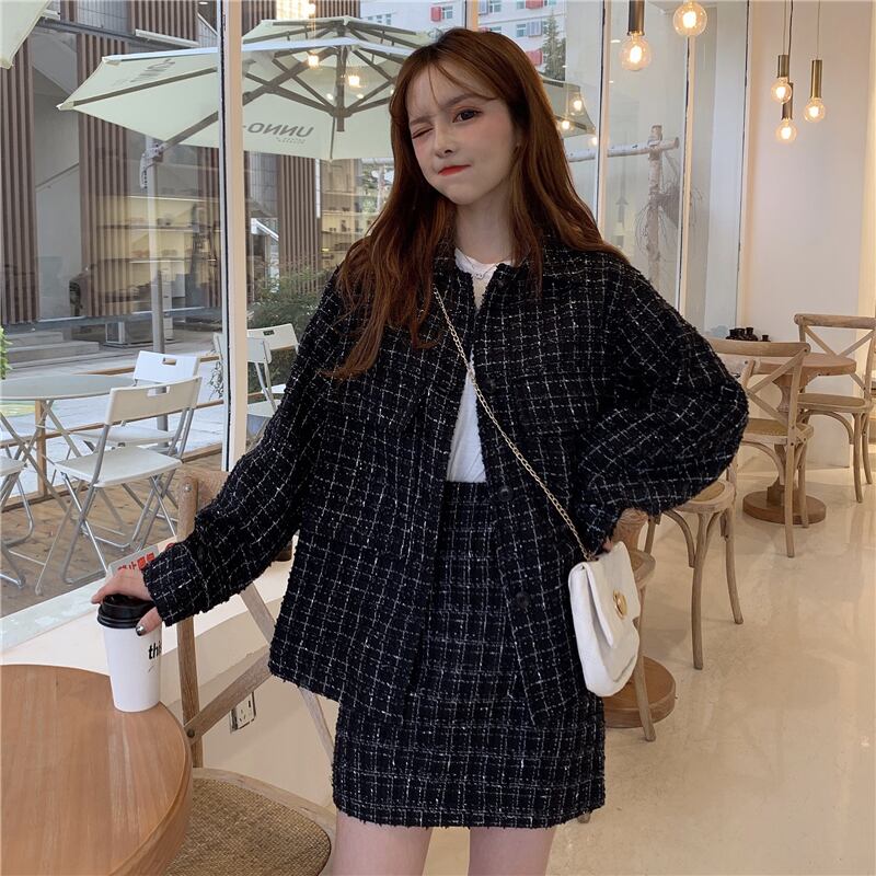 色:ミックスブラックチェックコートシングルピース,ミックスブラックチェックスカートシングルピース