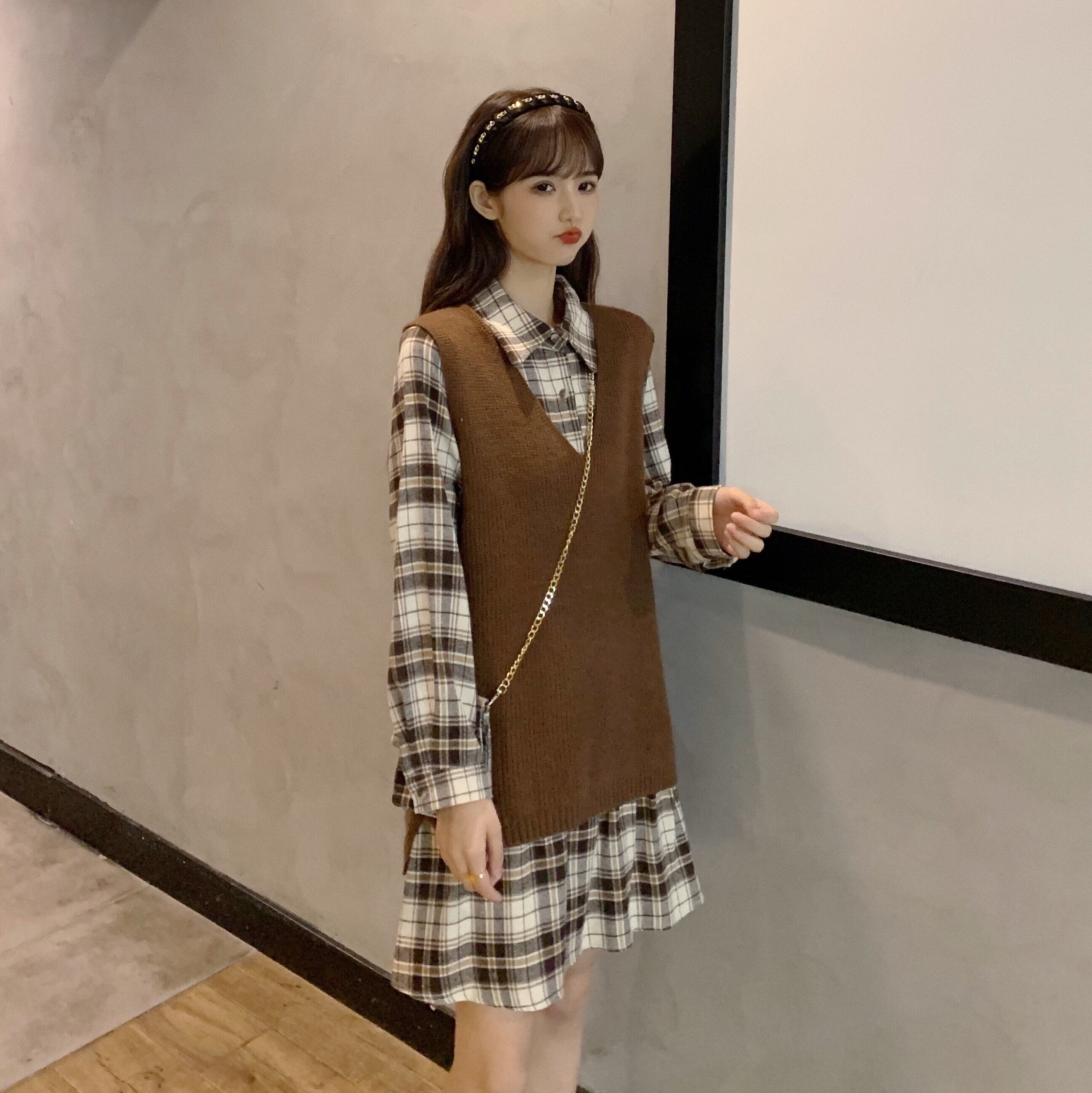 ルーズスタンダード格子柄 チェックシャツ ドレス ワンピースソリッド カラーVネックセット ロング マキシロング丈 マキシ丈 レトロ ソリッドカラー 女性 レディース ゆめかわ62257449171 | nice import1