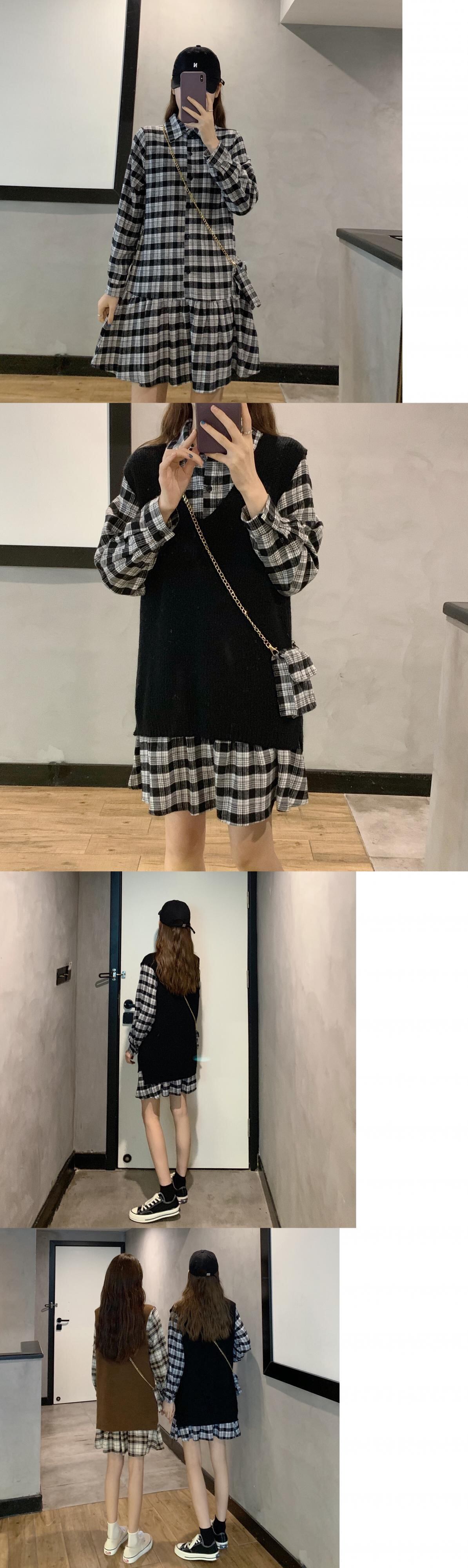 色:黒のチェック柄シャツスカート+バッグ,カーキチェック柄シャツワンピース+バッグ,ブラックベストワンピース,カーキベストワンピース
