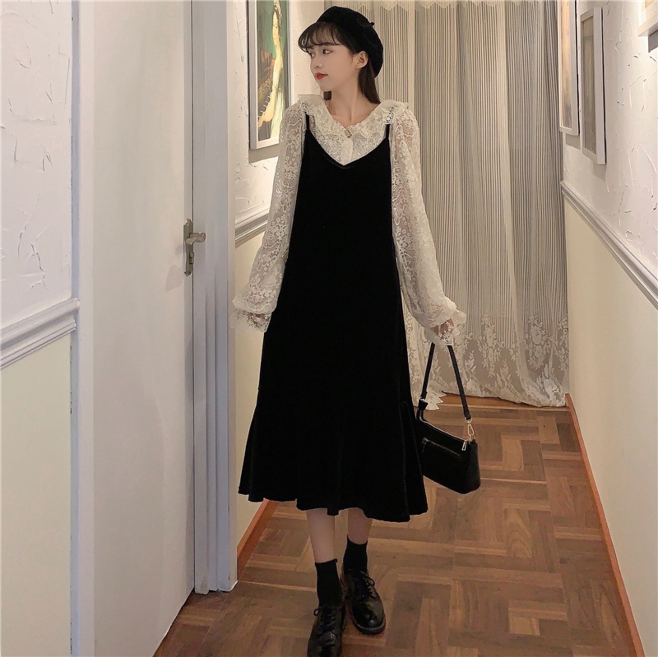色:アプリコットレースシャツワンピース,黒ワンピースワンピース