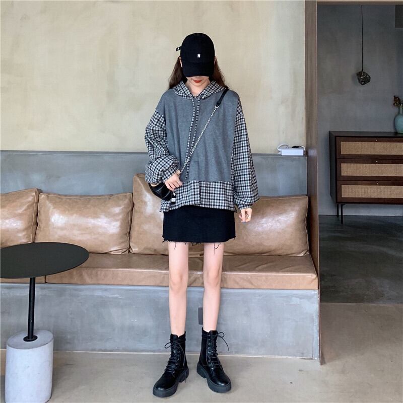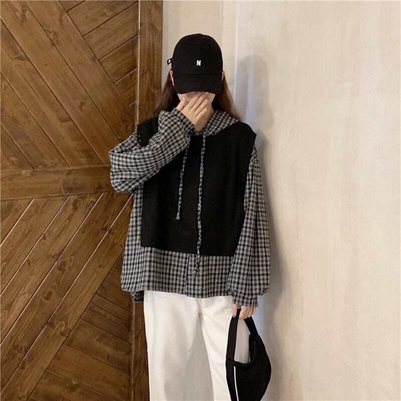 ルーズスタンダード格子柄 チェックフードニット セータートップス ロング マキシロング丈 マキシ丈 レトロ ステッチ 女性 レディース ゆめかわ54460175444