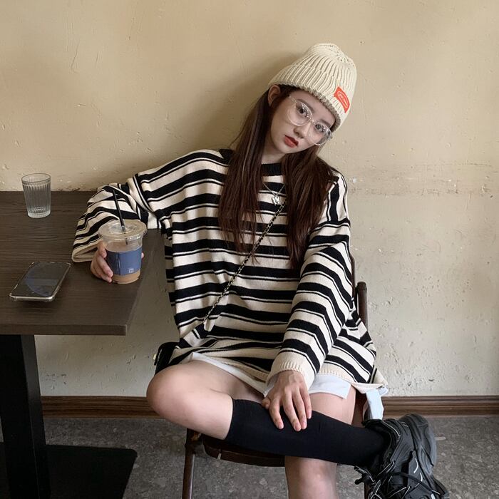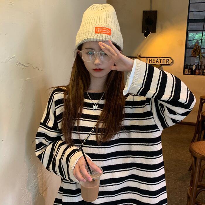 スタンダードストライプルーズプルオーバー ニット セーターロング マキシ ロング丈 マキシ丈カジュアルニットトップス レディース マキシロング丈 レトロ 女性 レディース ゆめかわ18643111631 | nice import1