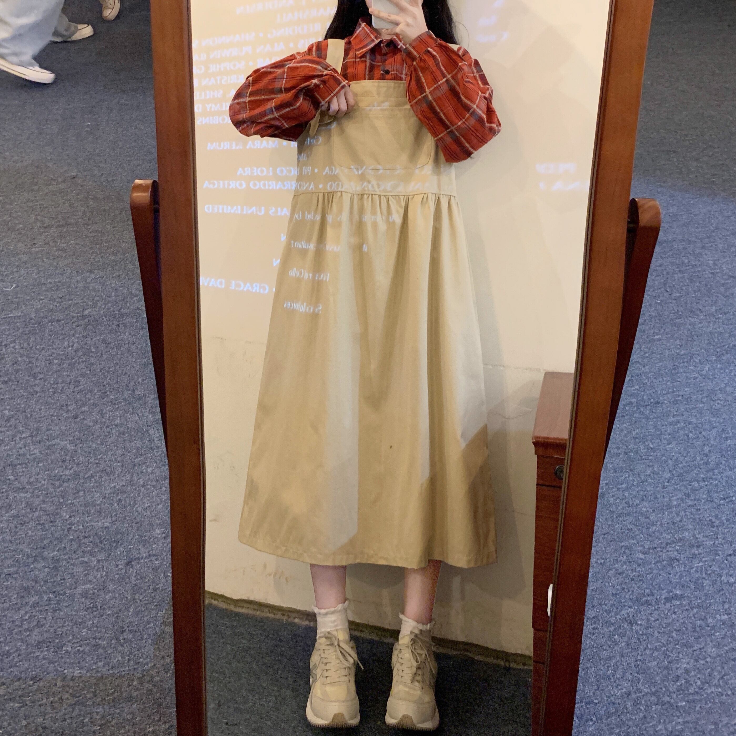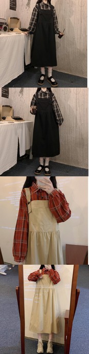 色:赤チェックシャツシングル,ブラックグリッドシャツ,ブラックストラップスカートワンピース,アプリコットストラップワンピース